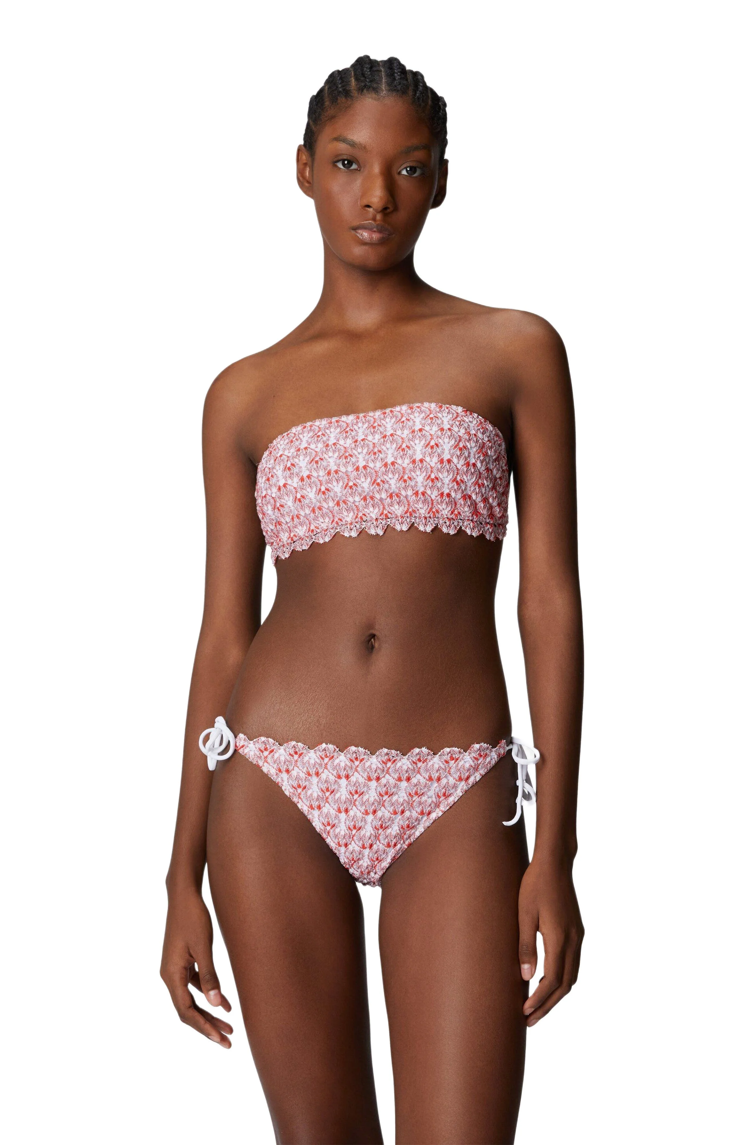 Missoni SS25 collection takes inspiration from the deserts, the sand, the oasis, and the color of the sky. The warmer color tones, reflect the endless lands of sand and all their hues. Green grass of the oasis, blue waters and contrast with the sandy color of the desert cover the rest of the collection's palette. The influence of this atmosphere echoes in the looks through stratifications, materials which are drier to the touch, fluidity and softness of shapes. Bikini Adjustable triangle Adjustable briefs Lace Lame inserts Hand wash Do not tumble dry Do not dry clean Do not iron Do not bleach