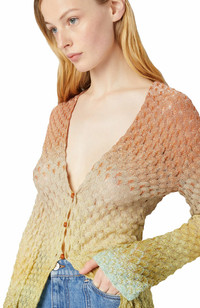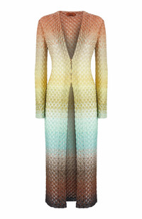 Missoni SS25 collection takes inspiration from the deserts, the sand, the oasis, and the color of the sky. The warmer color tones, reflect the endless lands of sand and all their hues. Green grass of the oasis, blue waters and contrast with the sandy color of the desert cover the rest of the collection's palette. The influence of this atmosphere echoes in the looks through stratifications, materials which are drier to the touch, fluidity and softness of shapes. Women's long cardigan Relaxed fit Lace and lame workmanship Central button fastening Dry cleaning in tetrachloroethene - mild process Do not tumble dry Dry flat Steam iron only Do not wash Do not iron Do not bleach