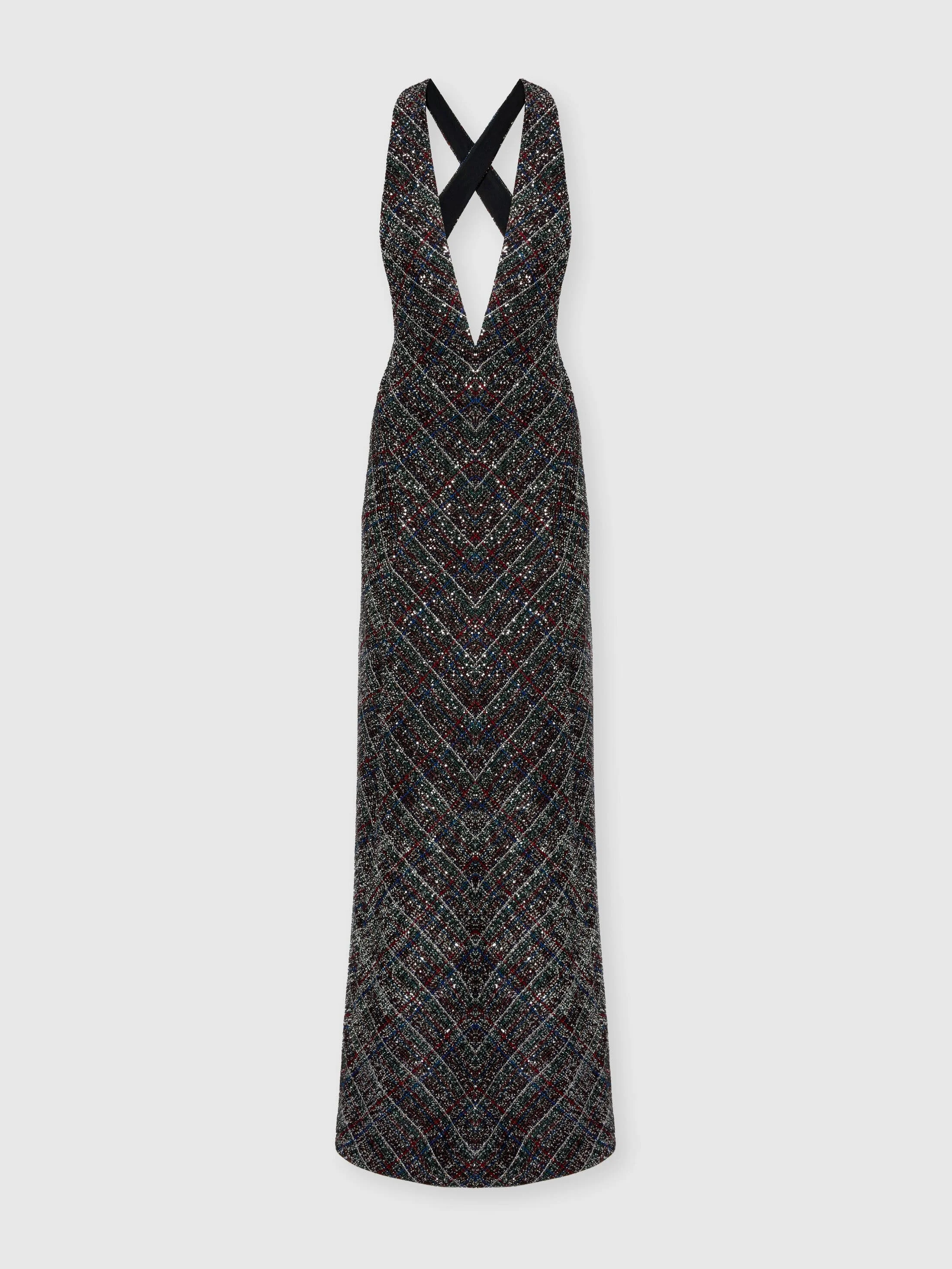 Missoni gets back to the essence, where matter and colour merge. Clothes are the words, but the speeches and stories are of those who wear them. The accent is on outerwear and tailoring: enveloping coats, trench coats, fluid suits, buttonless blazers, loose trousers. Extremes that meet, long tight dresses and liquid ones like caftans, graphic miniskirts and vaporous shirts. A transversal vision, where the sensuality of the body is felt, revealed or barely perceived. Long dress with deep V-neck Cross-back straps Caperdoni framework weaving Check pattern Viscose blend Lame filaments and sequins Hand wash Steam iron only Dry flat Do not tumble dry do not soak Do not dry clean Do not iron Do not bleach