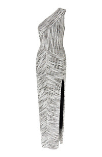Long one-shoulder dress with Greek lamé motif and slit