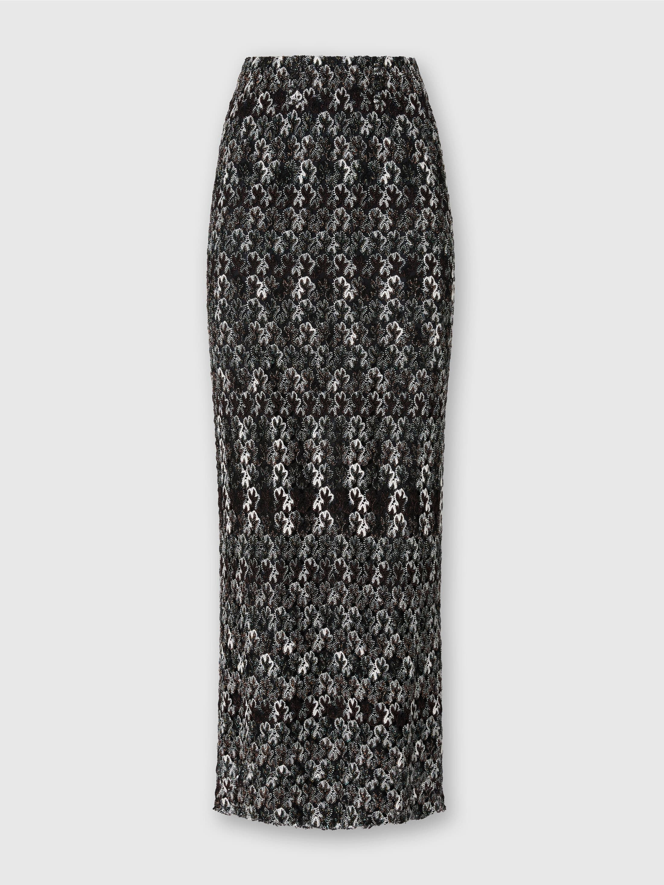 Missoni gets back to the essence, where matter and colour merge. Clothes are the words, but the speeches and stories are of those who wear them. The accent is on outerwear and tailoring: enveloping coats, trench coats, fluid suits, buttonless blazers, loose trousers. Extremes that meet, long tight dresses and liquid ones like caftans, graphic miniskirts and vaporous shirts. A transversal vision, where the sensuality of the body is felt, revealed or barely perceived. Long pencil skirt Raschel lace-effect knit Viscose blend with lame threads Dry cleaning in tetrachloroethene - mild process Ironing maximum temperature 110°C - without steam Do not tumble dry Dry flat Do not wash Do not bleach
