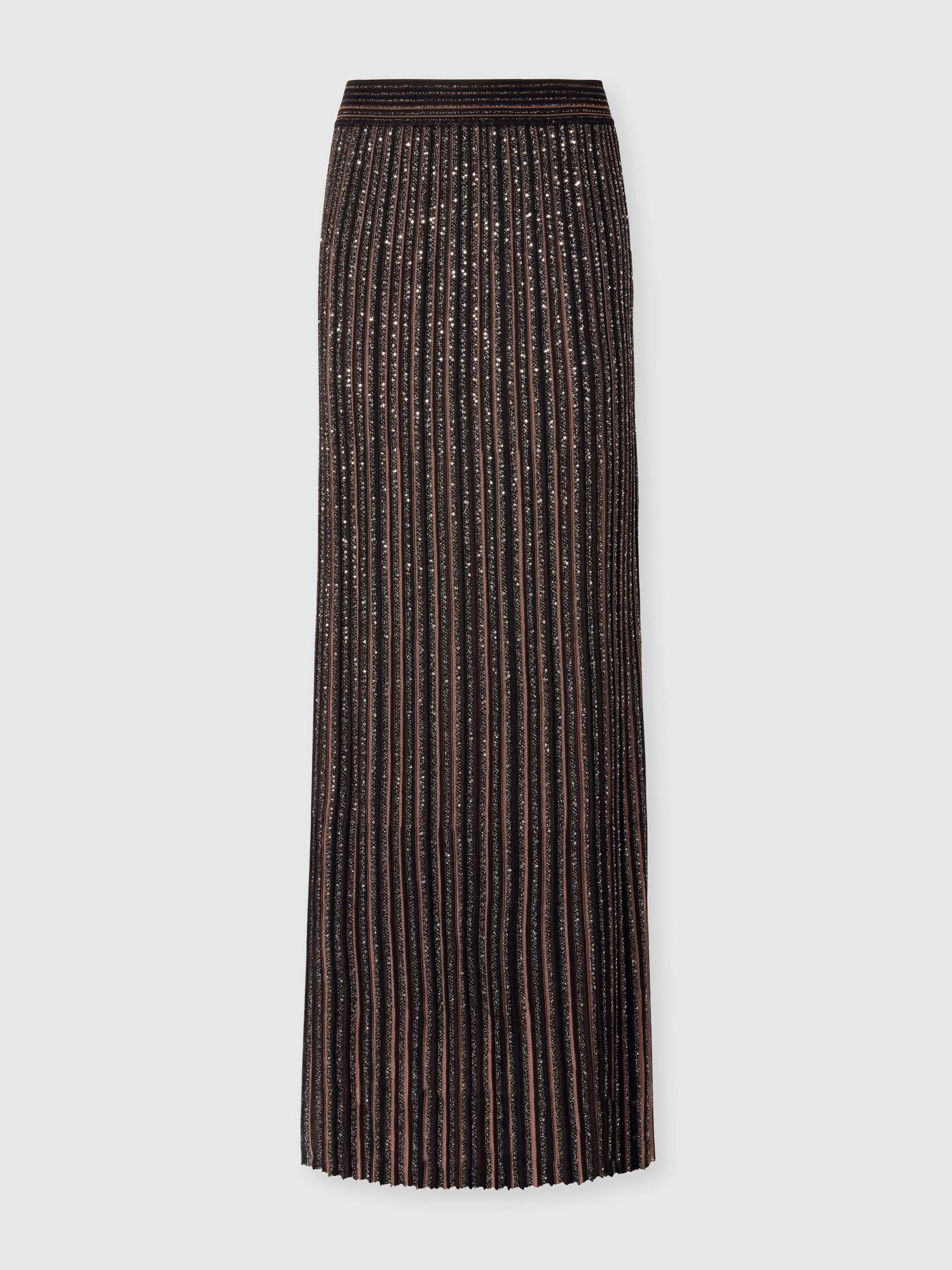 Missoni gets back to the essence, where matter and colour merge. Clothes are the words, but the speeches and stories are of those who wear them. The accent is on outerwear and tailoring: enveloping coats, trench coats, fluid suits, buttonless blazers, loose trousers. Extremes that meet, long tight dresses and liquid ones like caftans, graphic miniskirts and vaporous shirts. A transversal vision, where the sensuality of the body is felt, revealed or barely perceived. Women's long skirt Elasticated waistband Striped knit Viscose blend with lame yarns Ironing maximum temperature 110°C - without steam Dry cleaning in tetrachloroethene - mild process Wash in net bag Do not tumble dry Dry flat Iron inside out Dry inside out Do not wash Do not bleach