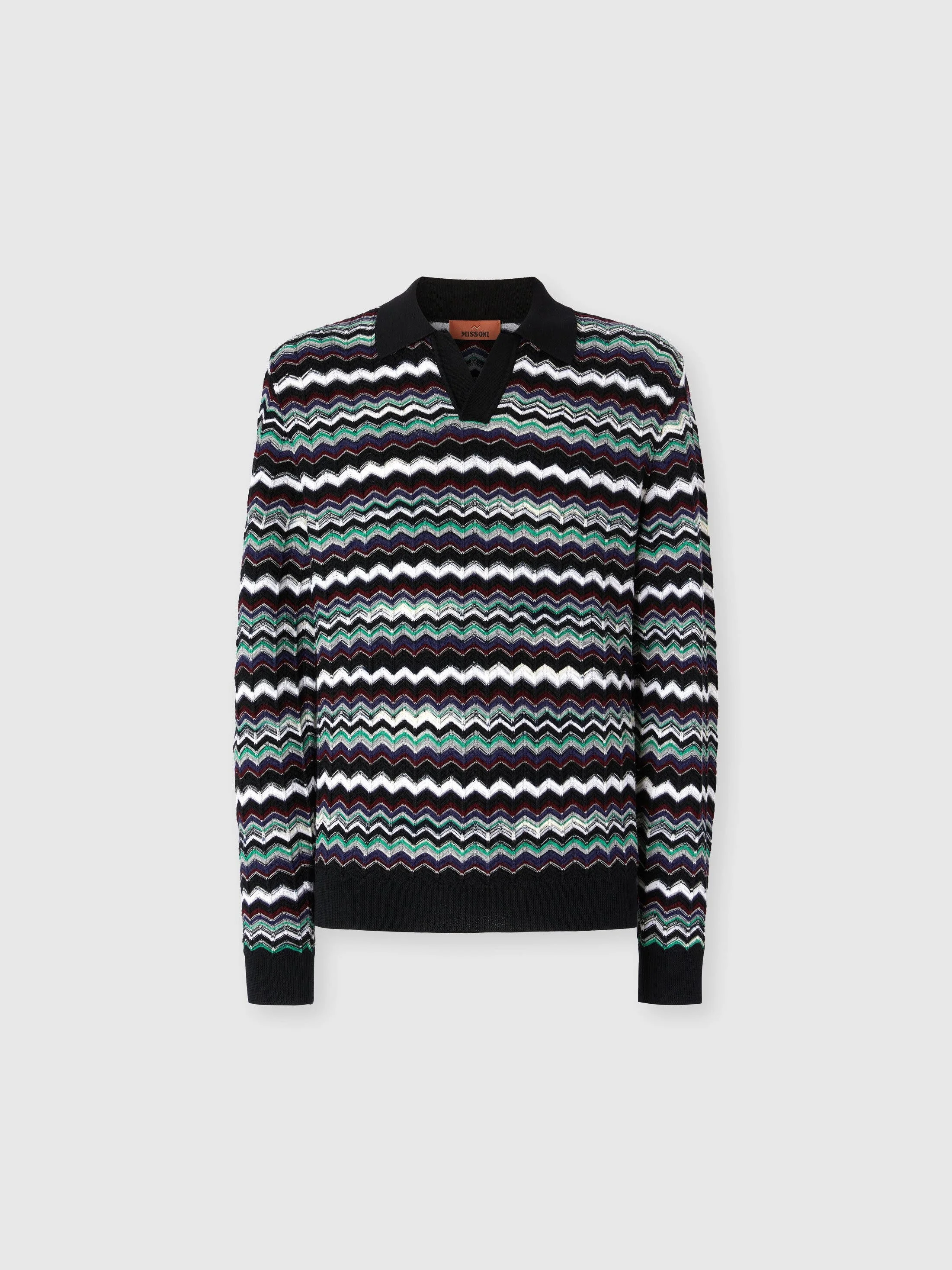 Missoni gets back to the essence, where matter and colour merge. Clothes are the words, but the speeches and stories are of those who wear them. The accent is on outerwear and tailoring: enveloping coats, trench coats, fluid suits, buttonless blazers, loose trousers. Extremes that meet, long tight dresses and liquid ones like caftans, graphic miniskirts and vaporous shirts. A transversal vision, where the sensuality of the body is felt, revealed or barely perceived. Long-sleeve polo with V-neck Zigzag pattern Contrast trims 100% cotton Hand wash Ironing maximum temperature 110°C - without steam Dry cleaning in tetrachloroethene Dry flat Do not tumble dry Do not bleach