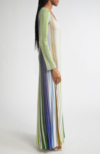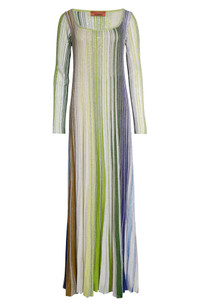 Sequin-sprinkled stripes spun through Missoni's retro-eclectic color wheel seamlessly shift into soft pleats on this soiree-worthy sweater-dress winked with twinkling metallic threads. Scoop neck Long sleeves 73% rayon, 10% polyamide, 8% metallic fibers, 8% polyester, 1% elastane Dry clean or hand wash, dry flat Made in Italy Designer Clothing