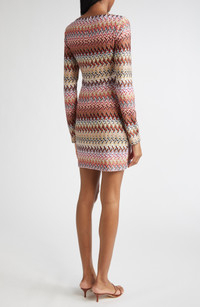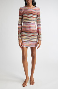 Iconic since their '60s debut, Missoni's signature zigzags bring kaleidoscopic color to this raschel-knit minidress shimmered with twinkling metallic threads. Hidden back-zip closure Jewel neck Long sleeves Stretch lining 89% rayon, 6% metallic fibers, 5% polyamide Dry clean Made in Italy Designer Clothing
