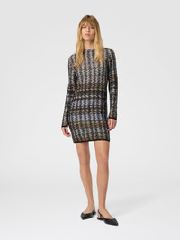 Missoni gets back to the essence, where matter and colour merge. Clothes are the words, but the speeches and stories are of those who wear them. The accent is on outerwear and tailoring: enveloping coats, trench coats, fluid suits, buttonless blazers, loose trousers. Extremes that meet, long tight dresses and liquid ones like caftans, graphic miniskirts and vaporous shirts. A transversal vision, where the sensuality of the body is felt, revealed or barely perceived. Mini dress Long sleeves Boat neckline Chevron motif Viscose blend Lurex threads Dry cleaning in tetrachloroethene - mild process Ironing maximum temperature 110°C - without steam Wash in net bag Do not tumble dry Steam iron only Iron inside out Dry flat Do not wash Do not bleach