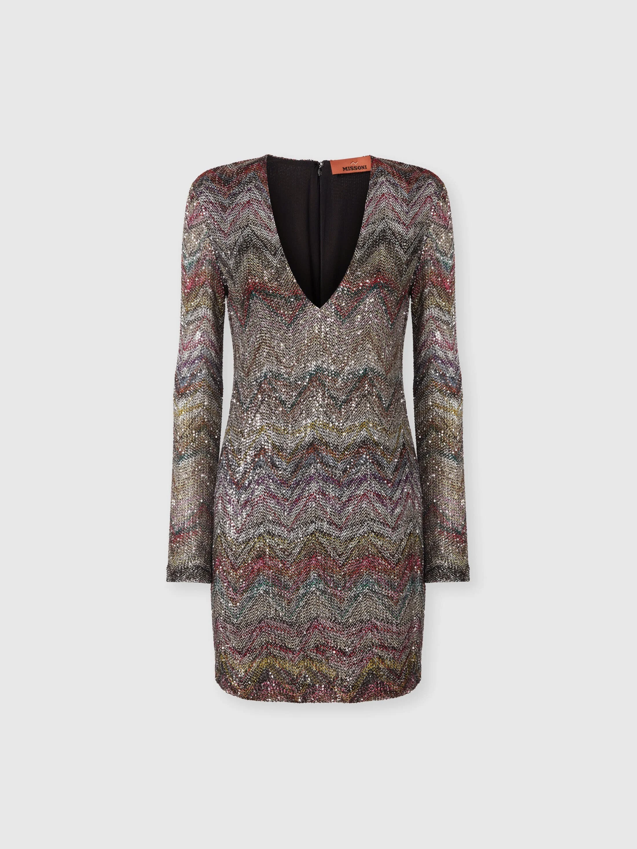 Missoni gets back to the essence, where matter and colour merge. Clothes are the words, but the speeches and stories are of those who wear them. The accent is on outerwear and tailoring: enveloping coats, trench coats, fluid suits, buttonless blazers, loose trousers. Extremes that meet, long tight dresses and liquid ones like caftans, graphic miniskirts and vaporous shirts. A transversal vision, where the sensuality of the body is felt, revealed or barely perceived. Mini dress V-neckline Caperdoni loom knit Zig zag motif Lurex threads and sequins Viscose blend Dry cleaning in tetrachloroethene - mild process Dry flat Steam iron only Do not tumble dry Do not wash Do not iron Do not bleach
