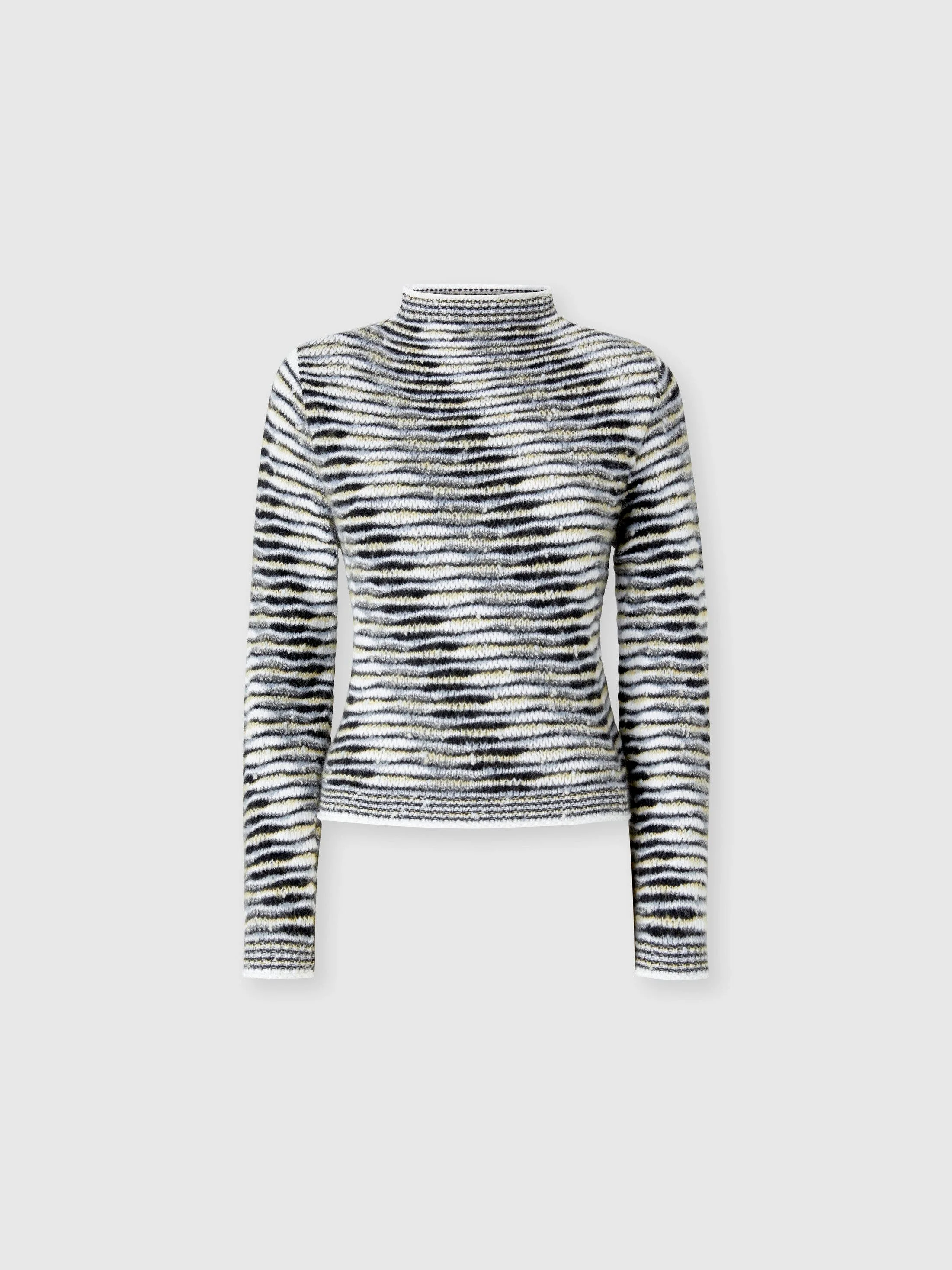 Missoni gets back to the essence, where matter and colour merge. Clothes are the words, but the speeches and stories are of those who wear them. The accent is on outerwear and tailoring: enveloping coats, trench coats, fluid suits, buttonless blazers, loose trousers. Extremes that meet, long tight dresses and liquid ones like caftans, graphic miniskirts and vaporous shirts. A transversal vision, where the sensuality of the body is felt, revealed or barely perceived. Mock neck sweater Boxy fit Flame knit Cotton blend Hand wash Ironing maximum temperature 110°C - without steam Wash inside out Dry cleaning in tetrachloroethene Dry flat Do not tumble dry COOL HAND WASH Iron with a cloth between Do not bleach