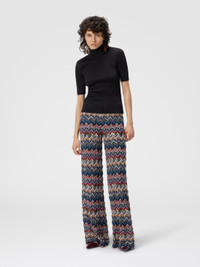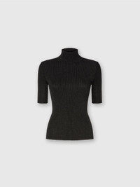 Missoni gets back to the essence, where matter and colour merge. Clothes are the words, but the speeches and stories are of those who wear them. The accent is on outerwear and tailoring: enveloping coats, trench coats, fluid suits, buttonless blazers, loose trousers. Extremes that meet, long tight dresses and liquid ones like caftans, graphic miniskirts and vaporous shirts. A transversal vision, where the sensuality of the body is felt, revealed or barely perceived. Short-sleeve mock neck sweater Vanise knit Viscose blend with lame threads Dry cleaning in tetrachloroethene - mild process Ironing maximum temperature 110°C - without steam Do not tumble dry Dry flat Iron inside out Dry inside out Iron with a cloth between Do not wash Do not bleach