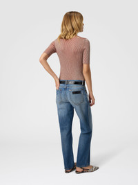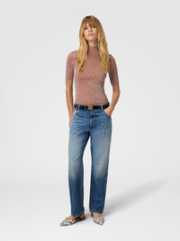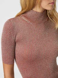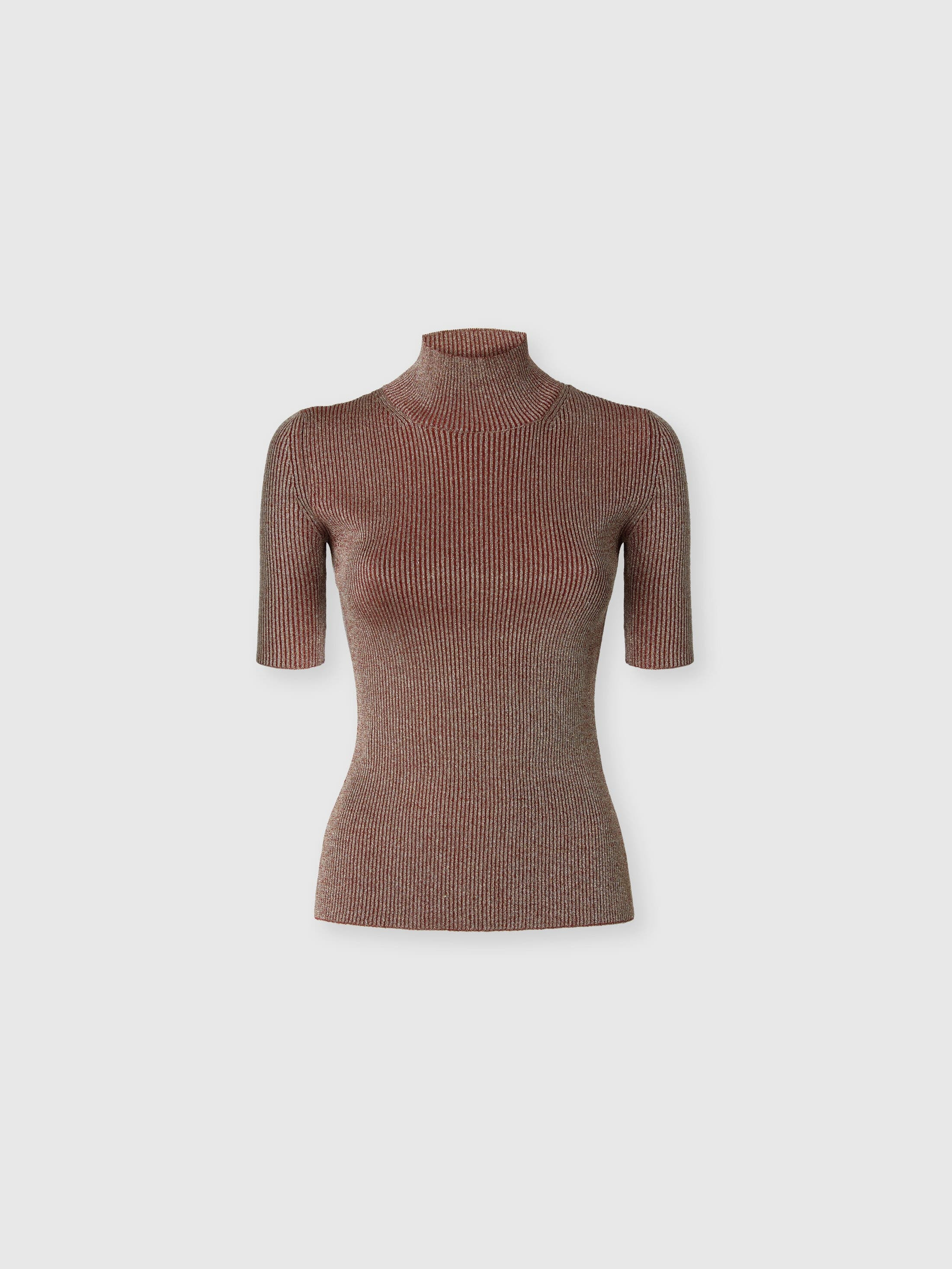 Missoni gets back to the essence, where matter and colour merge. Clothes are the words, but the speeches and stories are of those who wear them. The accent is on outerwear and tailoring: enveloping coats, trench coats, fluid suits, buttonless blazers, loose trousers. Extremes that meet, long tight dresses and liquid ones like caftans, graphic miniskirts and vaporous shirts. A transversal vision, where the sensuality of the body is felt, revealed or barely perceived. Short-sleeve mock neck sweater Vanise knit Viscose blend with lame threads Dry cleaning in tetrachloroethene - mild process Ironing maximum temperature 110°C - without steam Do not tumble dry Dry flat Iron inside out Dry inside out Iron with a cloth between Do not wash Do not bleach