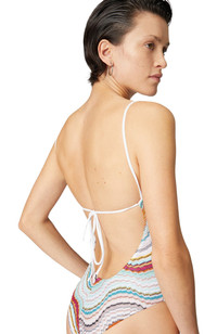 Contemporary sleekness and liberated sensuality imbue the Missoni Fall 2024 collection. Offsetting the masculine and the feminine, swinging between the slouchy and the skintight, the collection features pieces that build an ongoing Missoni wardrobe: long and short dresses, skimpy maxi-cardigans and blouson cardigans meant as outerwear; playful faux fur coats and pencil coats with faux fur oversized collars and trims; fluid pantsuits; jumpsuits and tops. One-piece swimsuit Wave pattern Raschel and lame processing Hand wash Do not tumble dry Do not dry clean Do not iron Do not bleach