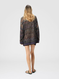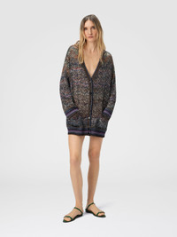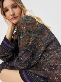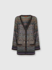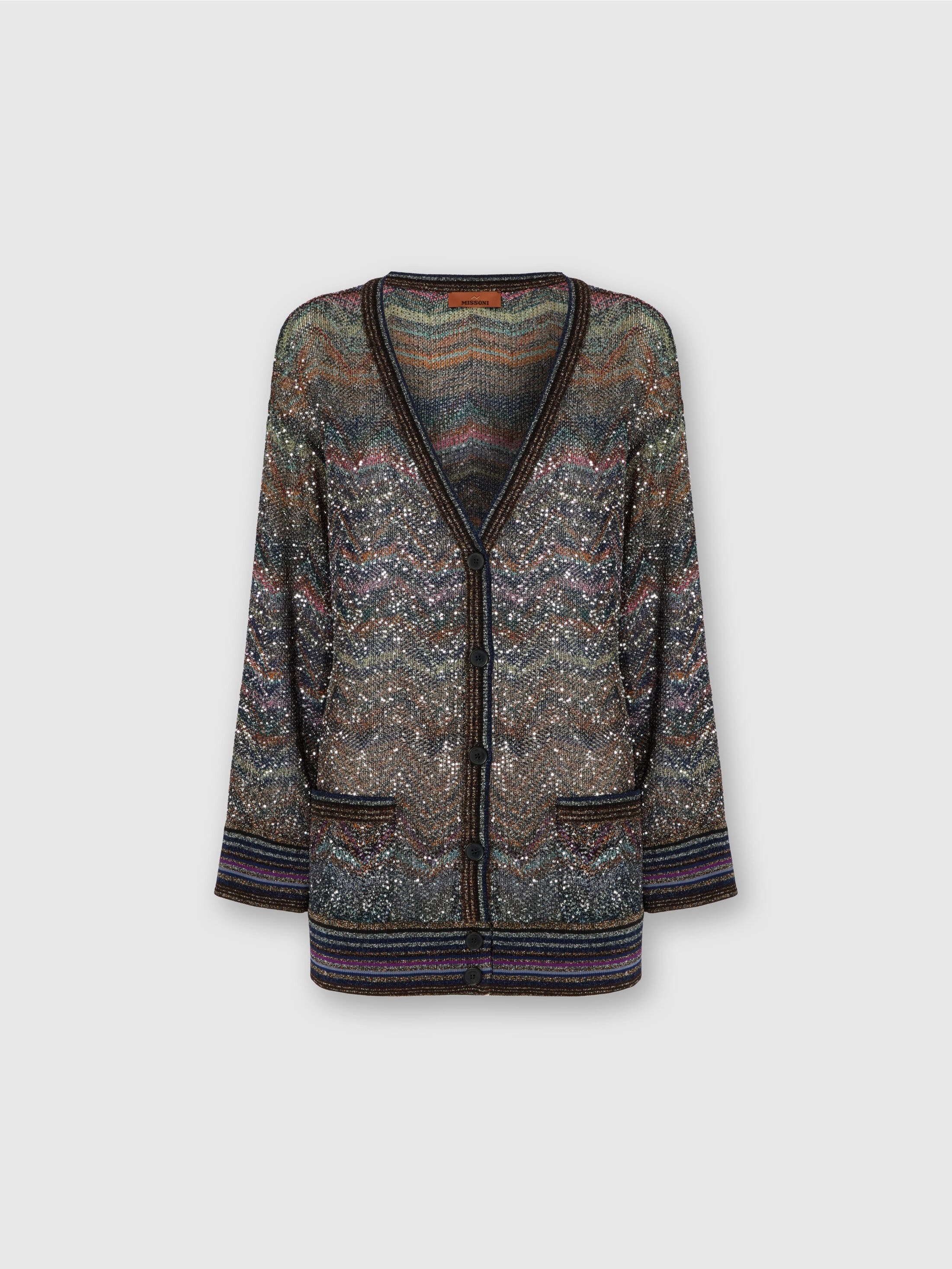 Missoni gets back to the essence, where matter and colour merge. Clothes are the words, but the speeches and stories are of those who wear them. The accent is on outerwear and tailoring: enveloping coats, trench coats, fluid suits, buttonless blazers, loose trousers. Extremes that meet, long tight dresses and liquid ones like caftans, graphic miniskirts and vaporous shirts. A transversal vision, where the sensuality of the body is felt, revealed or barely perceived. Oversized V-neck cardigan with buttons and pockets Caperdoni loom knit Zigzag pattern Viscose blend with lame threads Hand wash Dry cleaning in tetrachloroethene - mild process Steam iron only Dry flat Do not tumble dry Do not iron Do not bleach