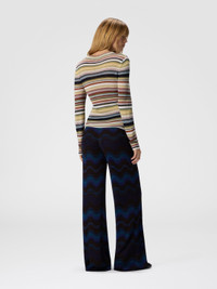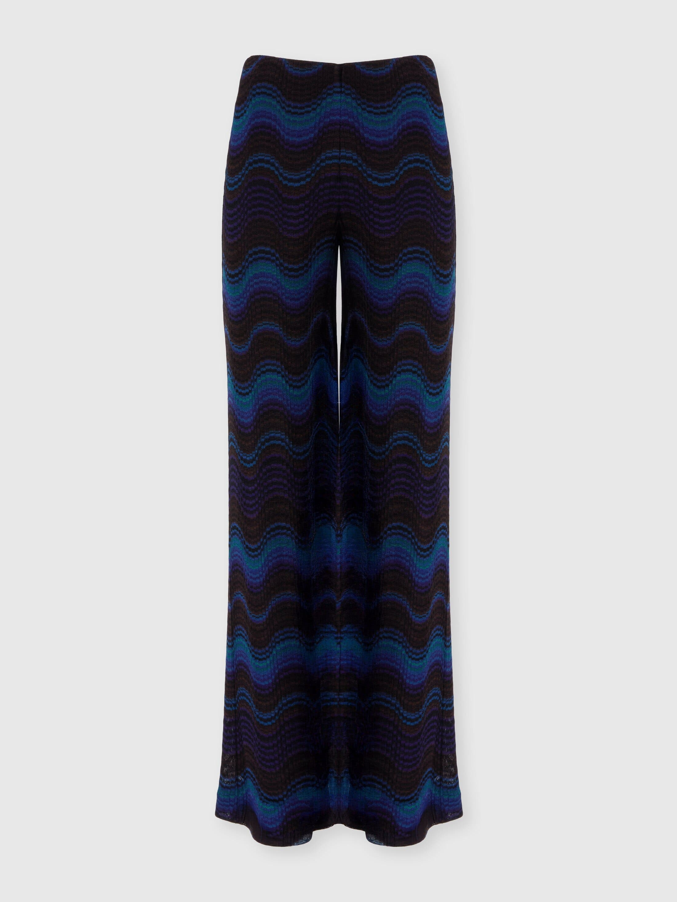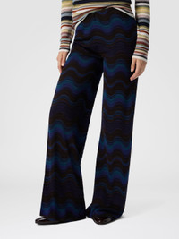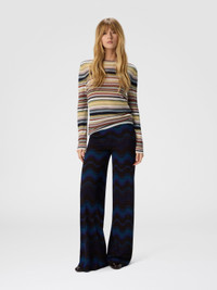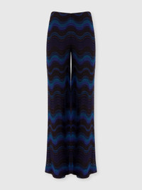 Missoni gets back to the essence, where matter and colour merge. Clothes are the words, but the speeches and stories are of those who wear them. The accent is on outerwear and tailoring: enveloping coats, trench coats, fluid suits, buttonless blazers, loose trousers. Extremes that meet, long tight dresses and liquid ones like caftans, graphic miniskirts and vaporous shirts. A transversal vision, where the sensuality of the body is felt, revealed or barely perceived. Women's palazzo pants Wave-pattern raschel knit 100% viscose Dry cleaning in tetrachloroethene - mild process Ironing maximum temperature 110°C - without steam Do not tumble dry Dry flat Do not wash Do not bleach