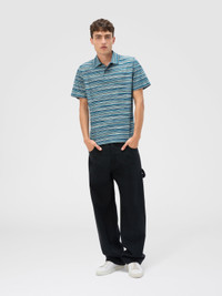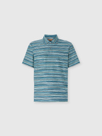 Missoni gets back to the essence, where matter and colour merge. Clothes are the words, but the speeches and stories are of those who wear them. The accent is on outerwear and tailoring: enveloping coats, trench coats, fluid suits, buttonless blazers, loose trousers. Extremes that meet, long tight dresses and liquid ones like caftans, graphic miniskirts and vaporous shirts. A transversal vision, where the sensuality of the body is felt, revealed or barely perceived. Short-sleeve polo Slub striped jersey jacquard knit Zigzag pattern 100% cotton Ironing maximum temperature 110°C - without steam Wash max 30°C - Mild process Dry cleaning in tetrachloroethene Do not tumble dry Do not bleach