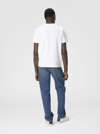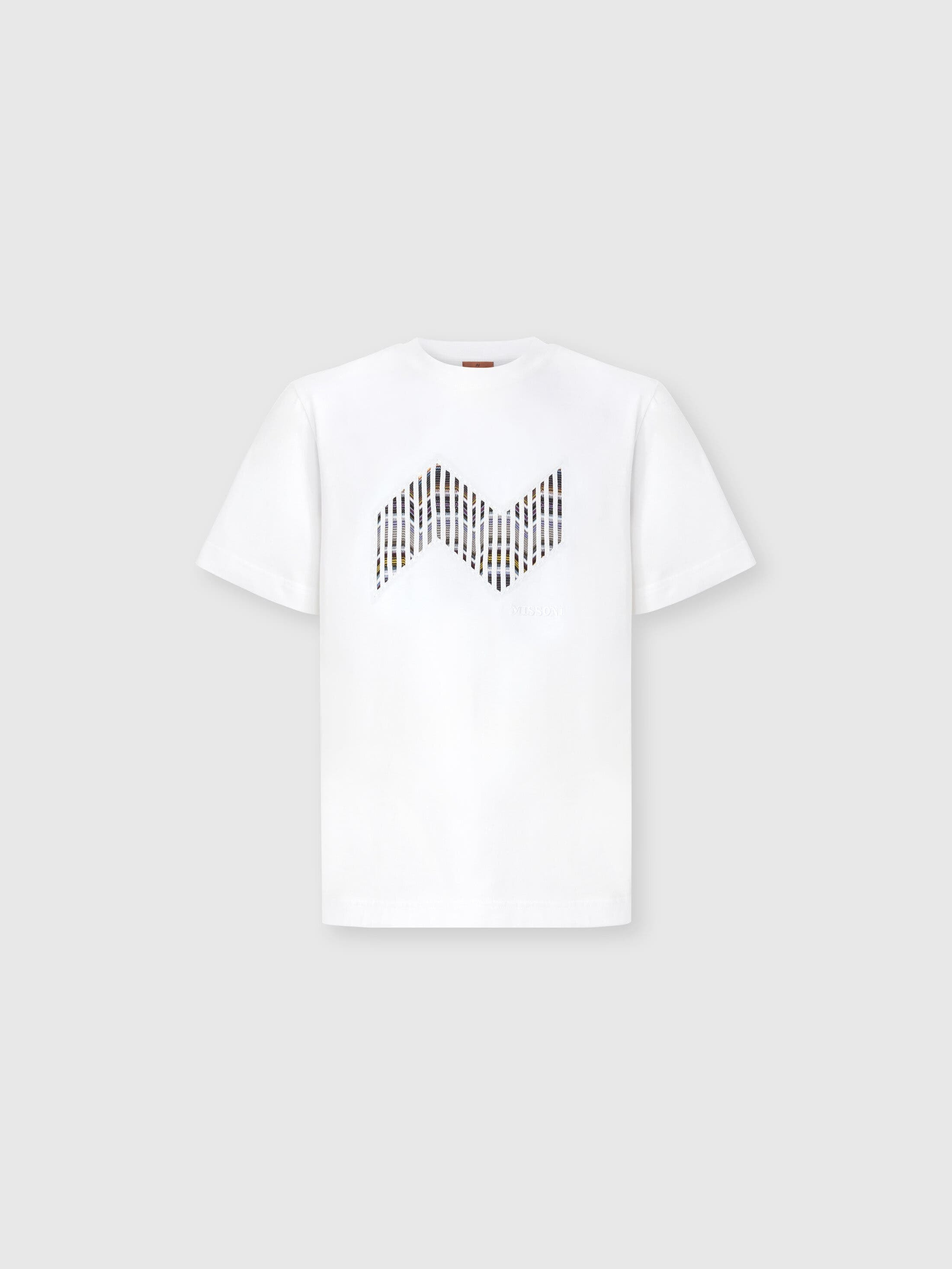 Missoni gets back to the essence, where matter and colour merge. Clothes are the words, but the speeches and stories are of those who wear them. The accent is on outerwear and tailoring: enveloping coats, trench coats, fluid suits, buttonless blazers, loose trousers. Extremes that meet, long tight dresses and liquid ones like caftans, graphic miniskirts and vaporous shirts. A transversal vision, where the sensuality of the body is felt, revealed or barely perceived. T-shirt short sleeve Regular fit 100% cotton Cotton jersey Geometric zigzag raschel insert Logo embroidery Wash max 30°C - Mild process Ironing maximum temperature 110°C - without steam Do not tumble dry Do not dry clean Do not bleach