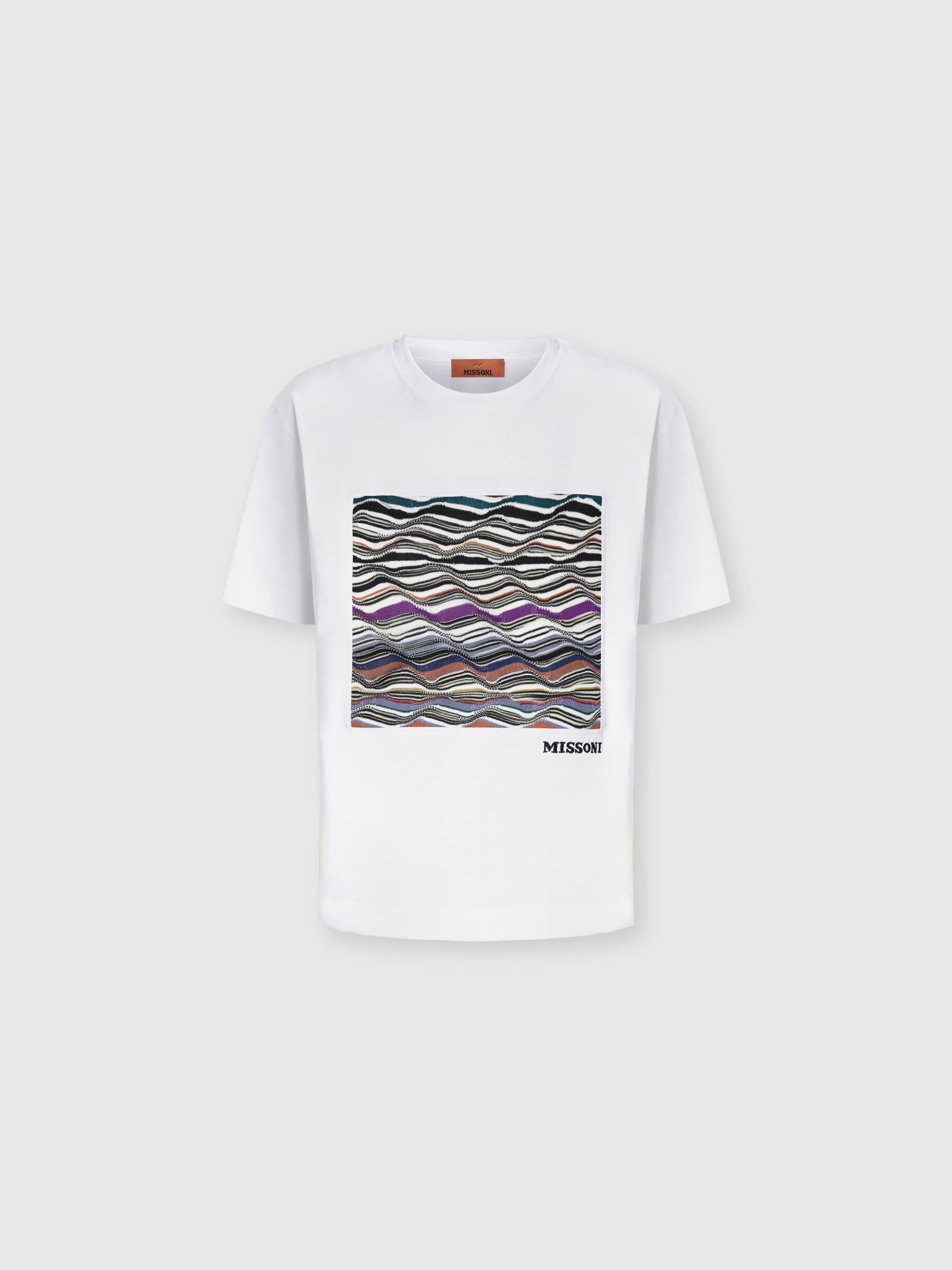 Missoni gets back to the essence, where matter and colour merge. Clothes are the words, but the speeches and stories are of those who wear them. The accent is on outerwear and tailoring: enveloping coats, trench coats, fluid suits, buttonless blazers, loose trousers. Extremes that meet, long tight dresses and liquid ones like caftans, graphic miniskirts and vaporous shirts. A transversal vision, where the sensuality of the body is felt, revealed or barely perceived. Short-sleeved T-shirt Cotton jersey Wavy knit insert and logo Dry cleaning in tetrachloroethene - mild process Wash max 30°C - Very mild process Do not tumble dry Dry flat Steam iron only Do not iron Do not bleach