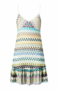 Missoni SS25 collection takes inspiration from the deserts, the sand, the oasis, and the color of the sky. The warmer color tones, reflect the endless lands of sand and all their hues. Green grass of the oasis, blue waters and contrast with the sandy color of the desert cover the rest of the collection's palette. The influence of this atmosphere echoes in the looks through stratifications, materials which are drier to the touch, fluidity and softness of shapes. Women's sleeveless mini dress Viscose with raschel lace workmanship Skirt with ruffles Dry cleaning in tetrachloroethene - mild process Dry flat Steam iron only Do not tumble dry Do not wash Do not iron Do not bleach