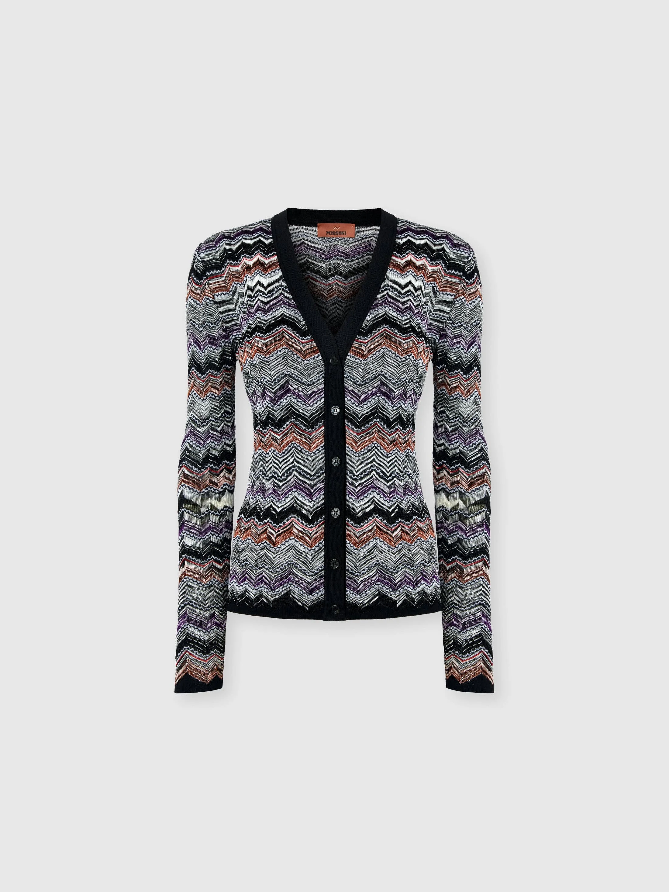 Missoni gets back to the essence, where matter and colour merge. Clothes are the words, but the speeches and stories are of those who wear them. The accent is on outerwear and tailoring: enveloping coats, trench coats, fluid suits, buttonless blazers, loose trousers. Extremes that meet, long tight dresses and liquid ones like caftans, graphic miniskirts and vaporous shirts. A transversal vision, where the sensuality of the body is felt, revealed or barely perceived. Slim buttoned cardigan Contrast trims English rib knit Flame raschel pattern Viscose and cotton blend Dry cleaning in tetrachloroethene - mild process Ironing maximum temperature 110°C - without steam Iron inside out Do not tumble dry Dry flat Do not wash Do not bleach