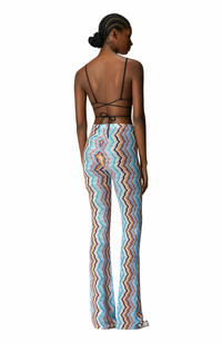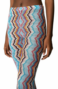 Missoni SS25 collection takes inspiration from the deserts, the sand, the oasis, and the color of the sky. The warmer color tones, reflect the endless lands of sand and all their hues. Green grass of the oasis, blue waters and contrast with the sandy color of the desert cover the rest of the collection's palette. The influence of this atmosphere echoes in the looks through stratifications, materials which are drier to the touch, fluidity and softness of shapes. Women's long pants Caperdoni workmanship Iconic zig zag pattern Viscose and lame blend workmanship Ironing maximum temperature 110°C - without steam Dry cleaning in tetrachloroethene Do not tumble dry Do not wash Do not bleach