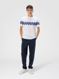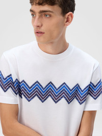 Missoni gets back to the essence, where matter and colour merge. Clothes are the words, but the speeches and stories are of those who wear them. The accent is on outerwear and tailoring: enveloping coats, trench coats, fluid suits, buttonless blazers, loose trousers. Extremes that meet, long tight dresses and liquid ones like caftans, graphic miniskirts and vaporous shirts. A transversal vision, where the sensuality of the body is felt, revealed or barely perceived. T-shirt short sleeve Regular fit 100% cotton Cotton jersey Maxi chevron slub intarsia Ironing maximum temperature 110°C - without steam Wash max 30°C - Mild process Dry cleaning in tetrachloroethene Do not tumble dry Do not bleach