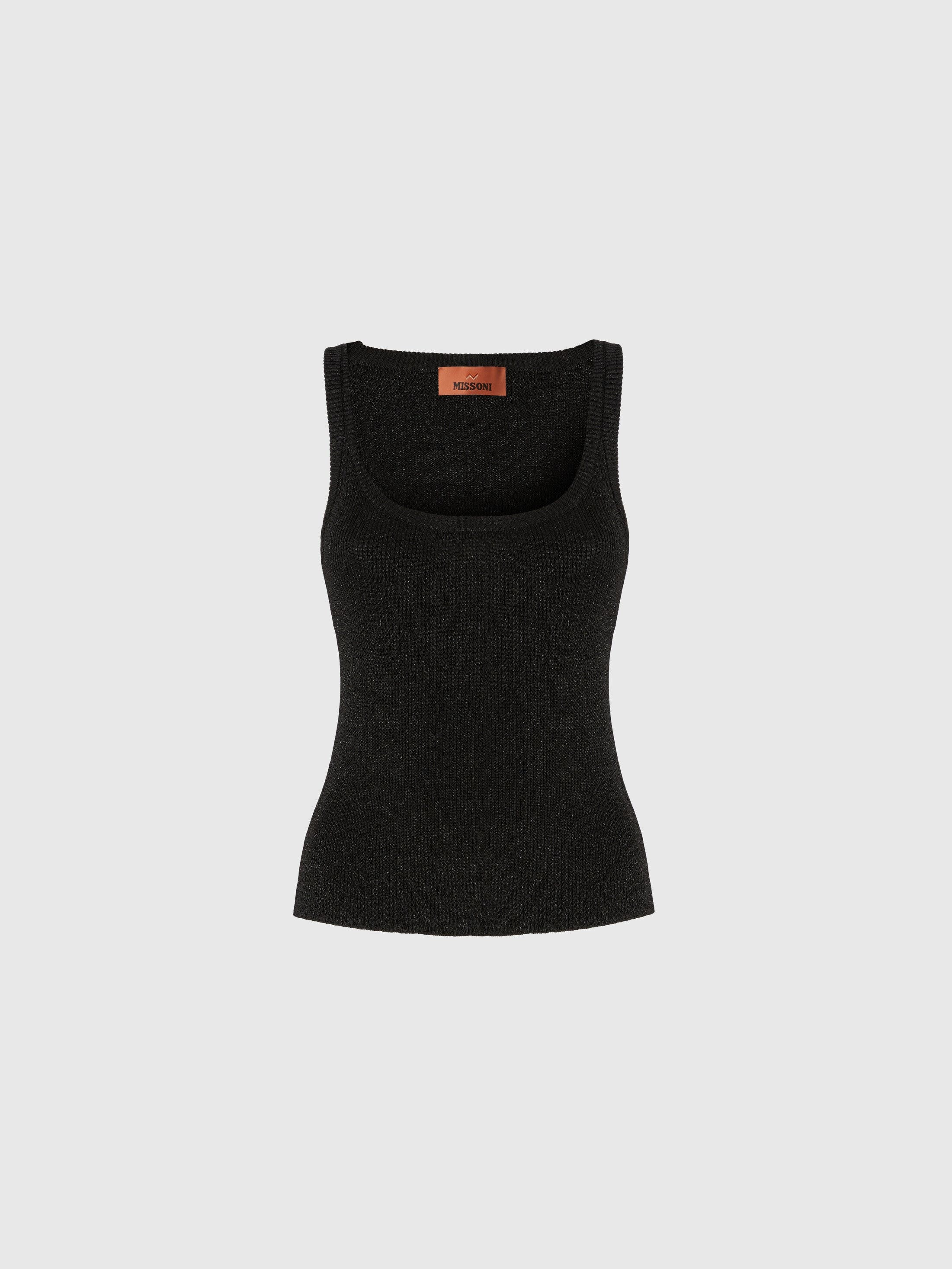 Missoni gets back to the essence, where matter and colour merge. Clothes are the words, but the speeches and stories are of those who wear them. The accent is on outerwear and tailoring: enveloping coats, trench coats, fluid suits, buttonless blazers, loose trousers. Extremes that meet, long tight dresses and liquid ones like caftans, graphic miniskirts and vaporous shirts. A transversal vision, where the sensuality of the body is felt, revealed or barely perceived. Tank top with round neckline Vanise knit Viscose and lame blend Ironing maximum temperature 110°C - without steam Dry cleaning in tetrachloroethene - mild process Do not tumble dry Dry flat Iron inside out Dry inside out Iron with a cloth between Do not wash Do not bleach