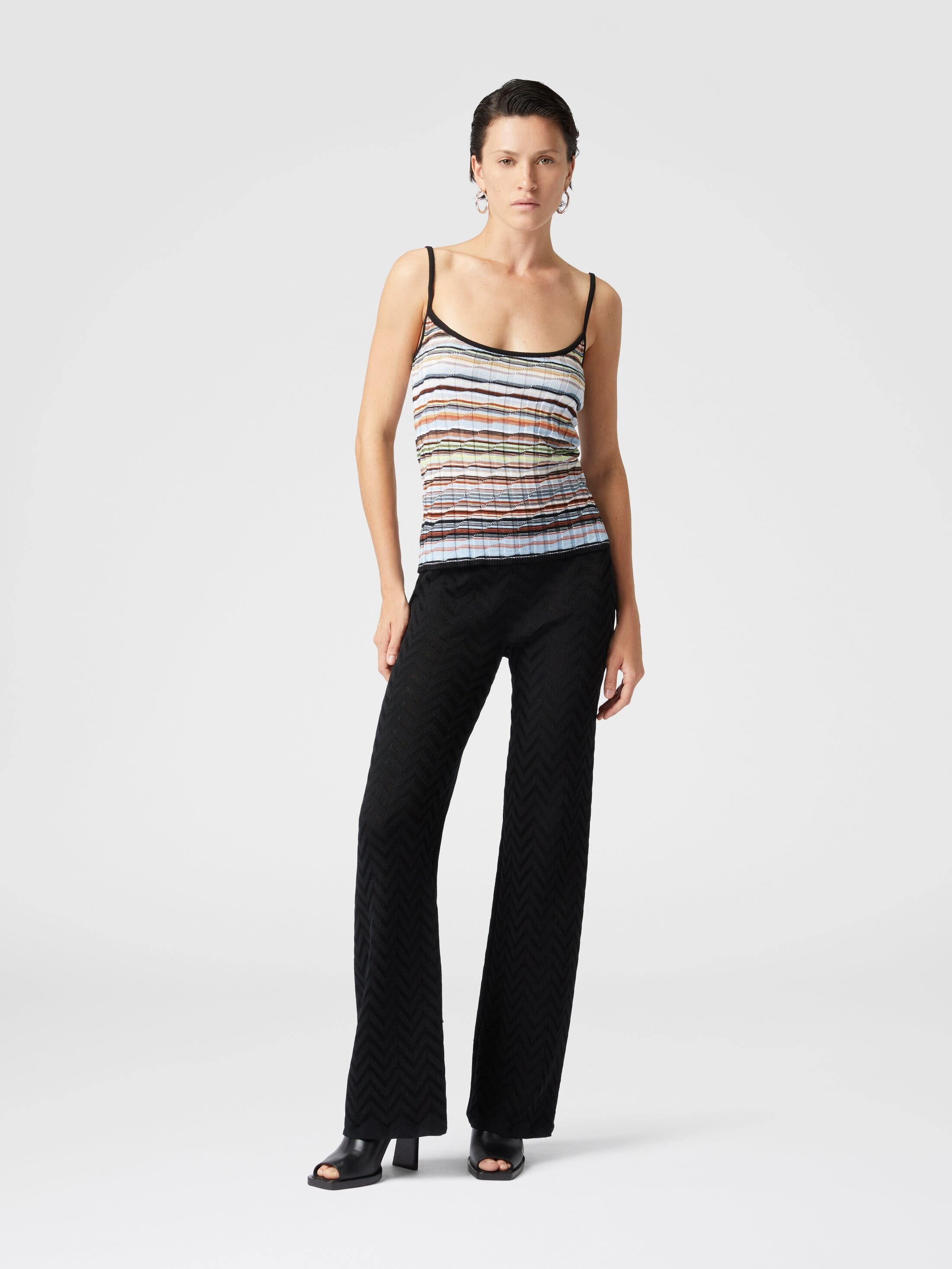 Contemporary sleekness and liberated sensuality imbue the Missoni Fall 2024 collection. Offsetting the masculine and the feminine, swinging between the slouchy and the skintight, the collection features pieces that build an ongoing Missoni wardrobe: long and short dresses, skimpy maxi-cardigans and blouson cardigans meant as outerwear; playful faux fur coats and pencil coats with faux fur oversized collars and trims; fluid pantsuits; jumpsuits and tops. Straight Pants Tonal chevron pattern Jacquard workmanship Elastic waistband Ironing maximum temperature 110°C - without steam Dry cleaning in tetrachloroethene - mild process Iron inside out Do not tumble dry Dry flat Dry inside out Do not wash Do not bleach