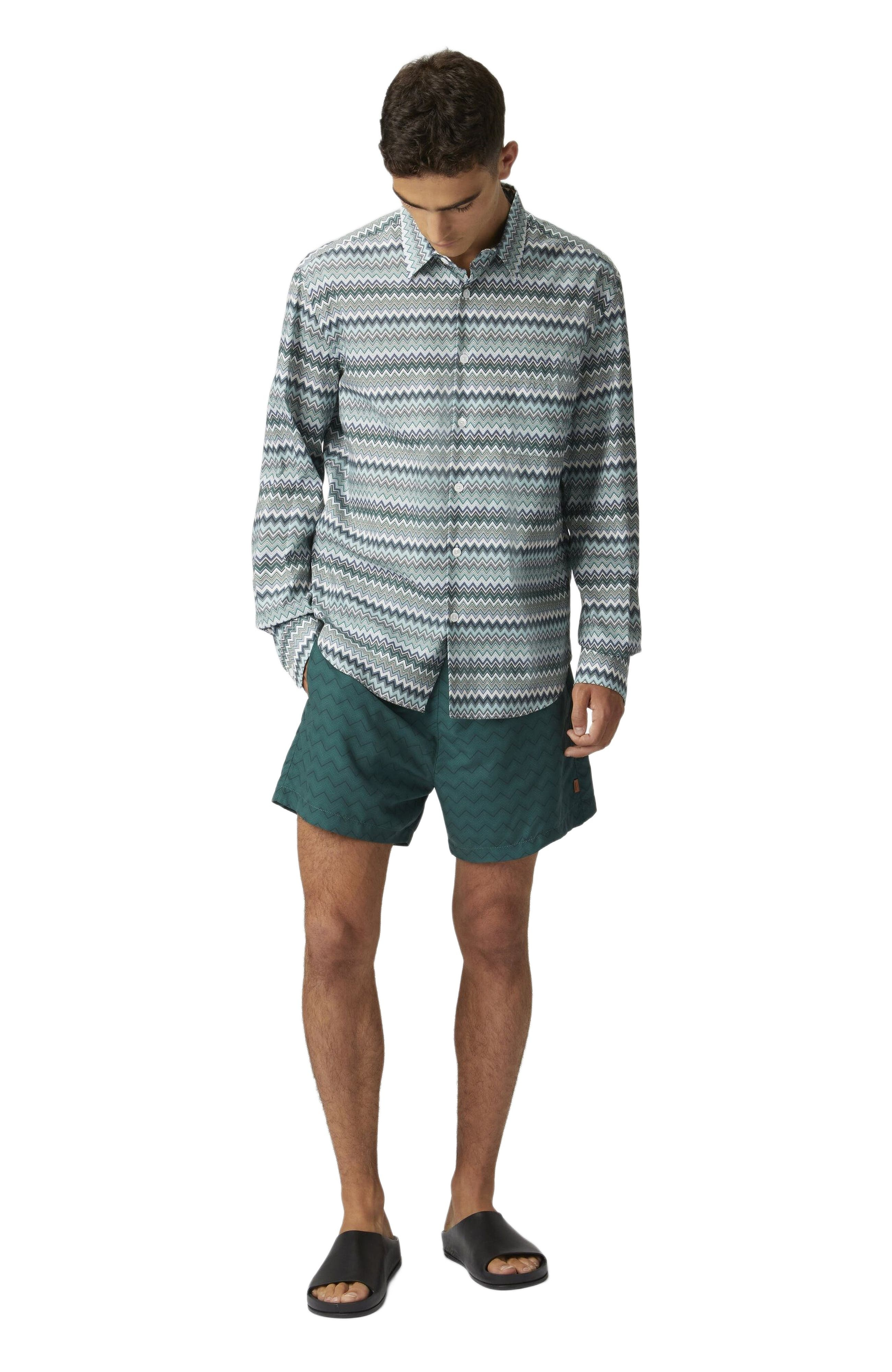 Contemporary sleekness and liberated sensuality imbue the Missoni Fall 2024 collection. Offsetting the masculine and the feminine, swinging between the slouchy and the skintight, the collection features pieces that build an ongoing Missoni wardrobe: long and short dresses, skimpy maxi-cardigans and blouson cardigans meant as outerwear; playful faux fur coats and pencil coats with faux fur oversized collars and trims; fluid pantsuits; jumpsuits and tops. Swim shorts Iconic zigzag pattern macro version Wash max 30°C - Mild process Do not tumble dry Do not dry clean Do not iron Do not bleach