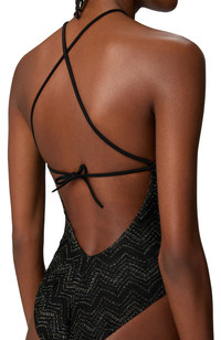 Zig zag lamé viscose one-piece swimsuit with halter neck