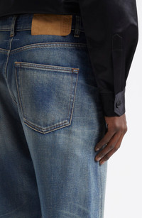 A deconstructionist approach to denim, these wide-leg, rigid-denim jeans play with proportion and texture through twisted front seams and hems that drape with insouciant ease. MM6’s restrained signatures—a horizontal stitch and numbered jacron label—quietly punctuate the back yoke. Zip fly with button closure Five-pocket style 100% cotton Machine wash, line dry Made in Italy Designer Clothing