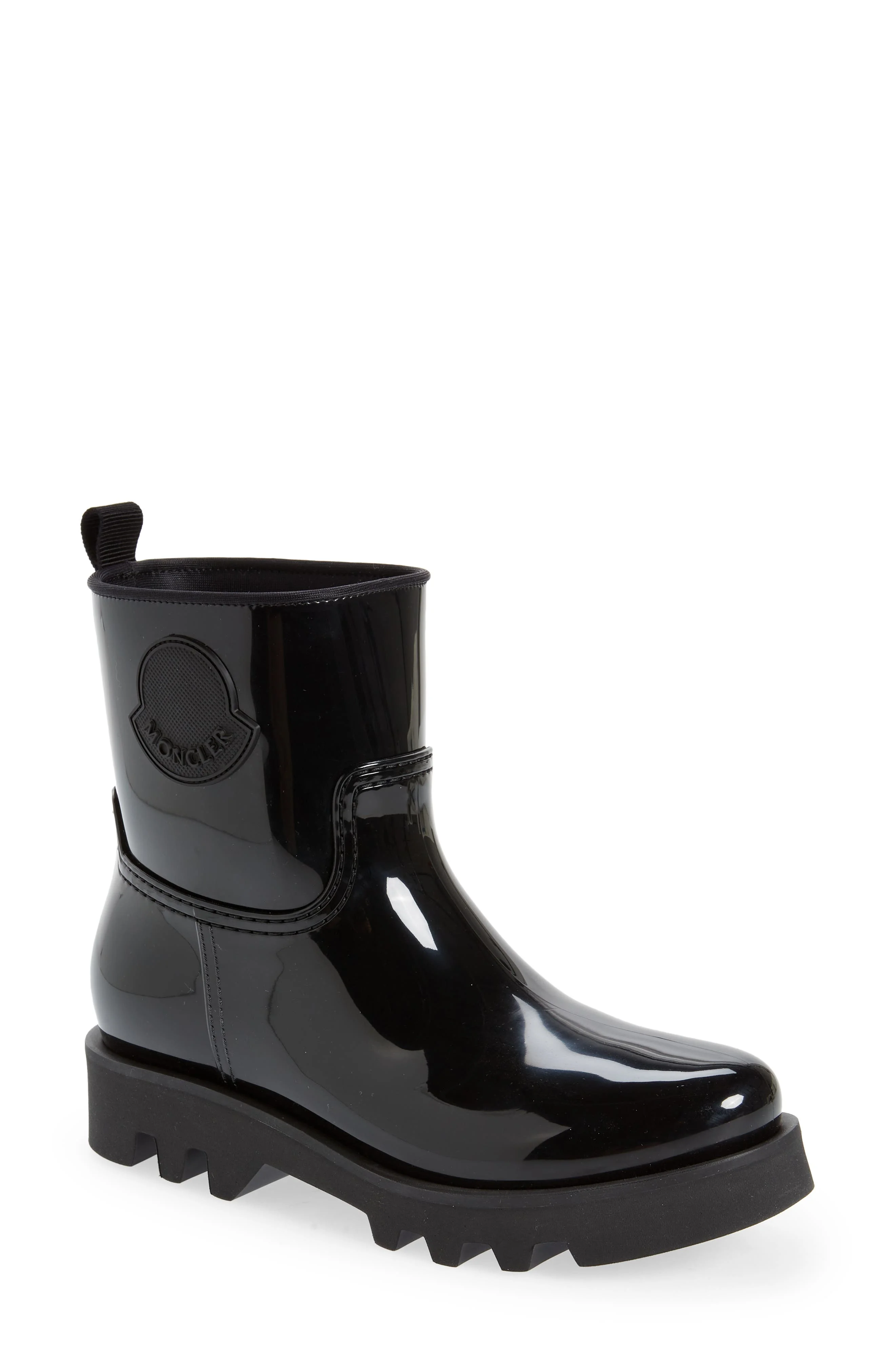 Take on drizzly days in signature Moncler style with this glossy waterproof rain boot branded with a rubberized logo patch and lettered grosgrain pull-tab. 1 1/2" (38mm) heel; 1" platform (size 39) 6 1/2" shaft Waterproof: protects against rain, puddles and slush to keep feet dry in wet conditions Pull-on style with pull-tab PVC upper/leather and synthetic lining/synthetic sole Made in Italy Women's Designer Shoes