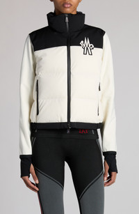 Part cardigan, part puffer, this colorblocked style offers lightweight warmth via a combo of a down-filled quilted core and collar plus stretch-fleece sleeves. Front zip closure Stand collar Elastic cuffs Front zip pockets Partially lined, with 90% down, 10% feather fill (Romania) Polyamide/polyester/elastane Machine wash, dry flat Made in Romania Designer Clothing