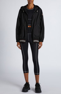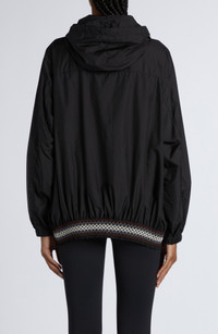 A colorful smocked hem lends a retro flourish to this hooded jacket featuring a lightweight packable design, making it perfect to throw into a bag just in case. Two-way front-zip closure Drawcord-toggle hood Elastic cuffs Front zip pockets Packs into pocket 100% polyamide Dry clean Imported Designer Clothing