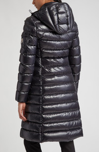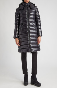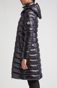 Moncler pairs technical know-how with refined materials on this long down parka featuring a streamlined, slim silhouette that offers warmth without bulk. A removable hood provides added protection during inclement conditions. Two-way front-zip closure Stand collar; removable hood Front zip pockets; sleeve snap-flap pocket Lined, with down fill 100% polyamide Dry clean Imported Designer Clothing