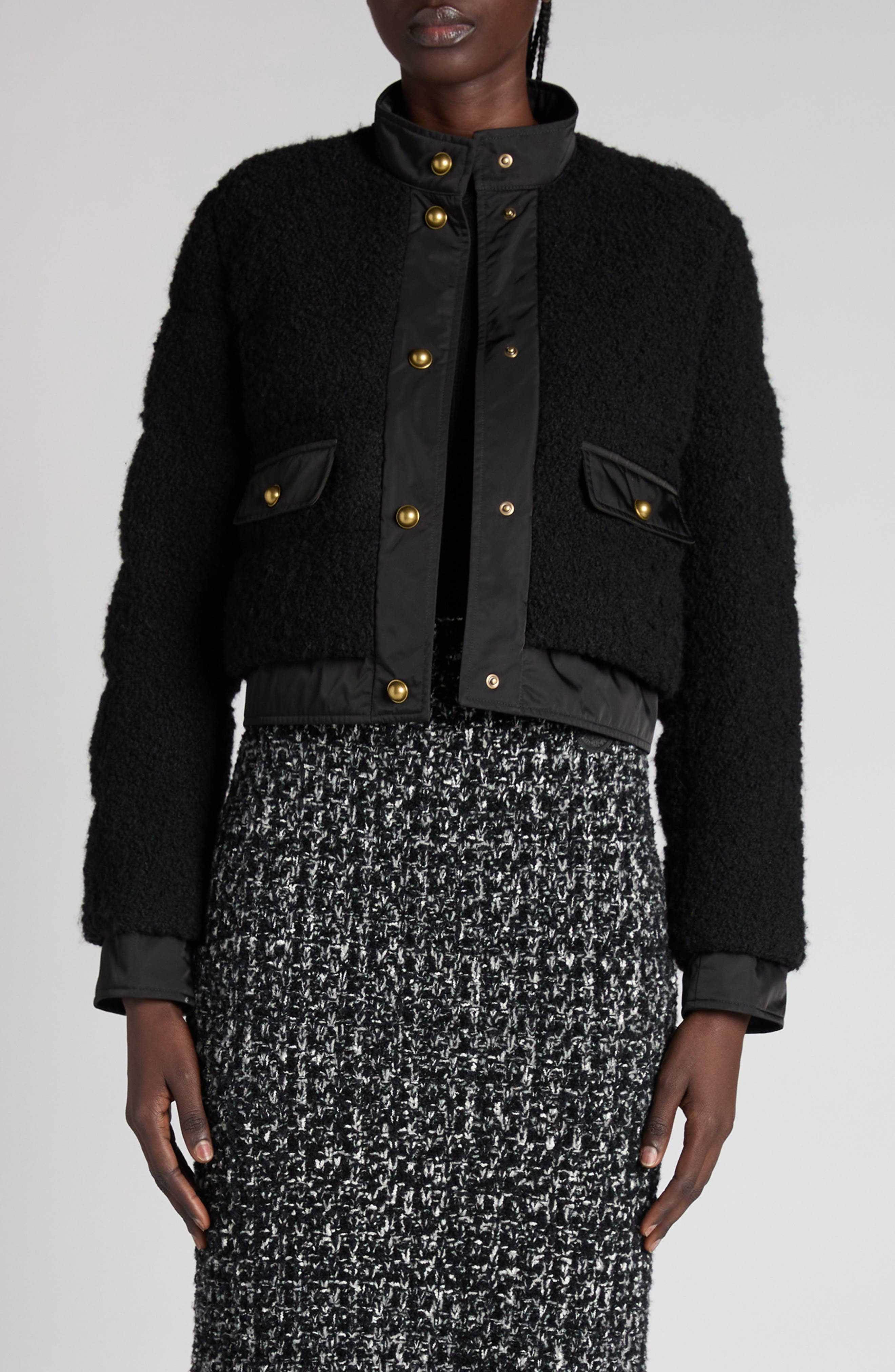 Bring a texture-rich look to your cool-weather ensembles with this down-insulated jacket made in a cropped silhouette from a mix of woolly boucle and sleek rainwear fabric. Front snap closure Stand collar Front snap-flap pockets Lined, with 90% down, 10% feather fill 46% acrylic, 38% wool, 16% polyester with 100% polyester contrast Dry clean Imported Designer Clothing