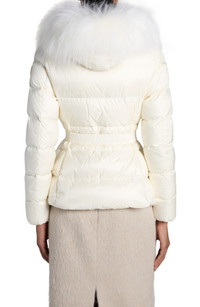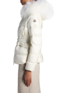 Silky genuine shearling at the hood brings a plush element to this down puffer crafted from longue saison fabric and finished with a removable elastic belt. Two-way front-zip closure Fixed hood Front zip pockets Removable belt Lined, with down fill 100% polyamide with genuine shearling (Romania) trim Machine wash, line dry; remove shearling for professional fur clean Imported Designer Clothing