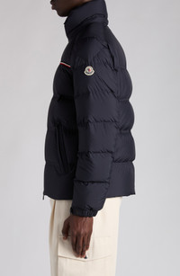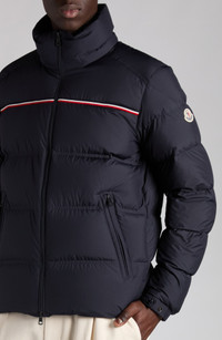 An embroidered stripe detail brings an eye-catching accent to this channel-quilted puffer jacket that offers signature Moncler warmth via lofty down fill. Two-way front-zip closure Stand collar Elastic cuffs Front zip pockets Lined, with 90% down, 10% feather fill 100% polyester Hand wash, dry flat Imported Designer Clothing