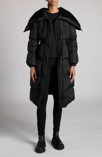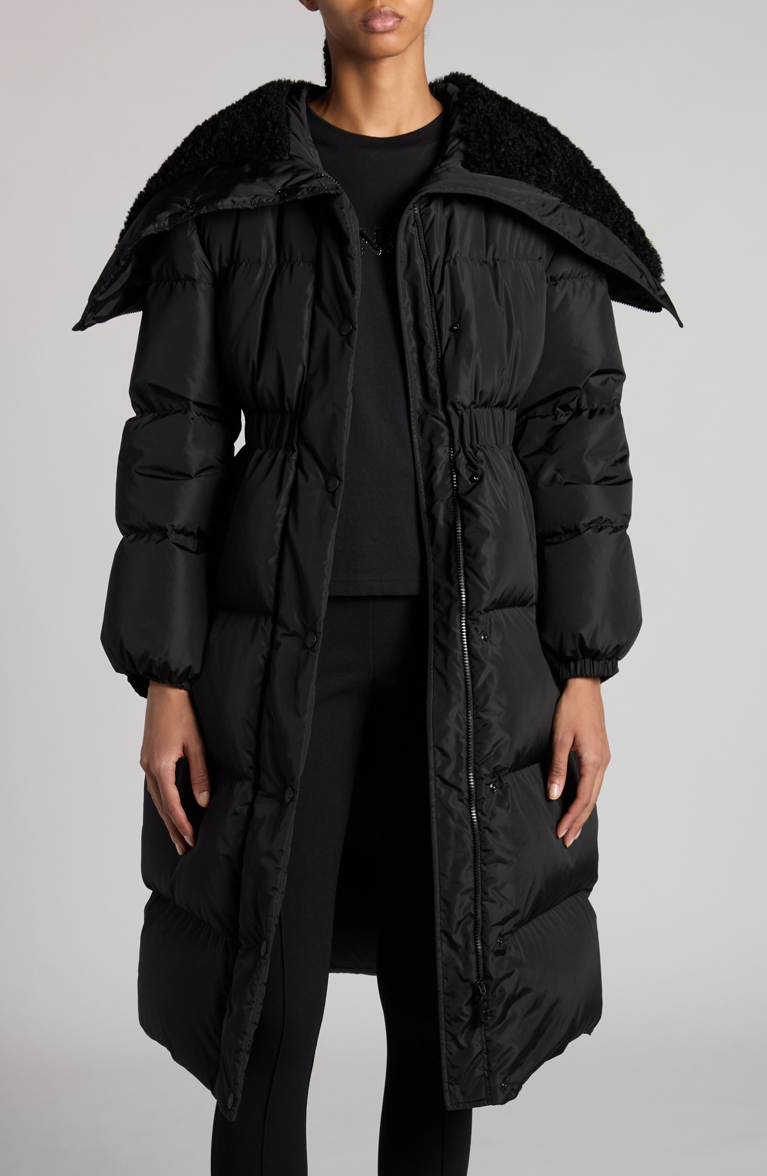 Fluffy faux shearling lining the zip-split hood elevates the cozy appeal of this longline coat that offers signature Moncler warmth via lofty down fill. Elastic at the cuffs and waist help lock in warmth. Two-way front-zip closure with snap storm placket Fixed hood Elastic cuffs On-seam pockets Elastic waist Lined, with 90% down, 10% feather fill (Romania) 100% polyamide with 100% polyester faux-shearling trim Dry clean Made in Romania Designer Clothing