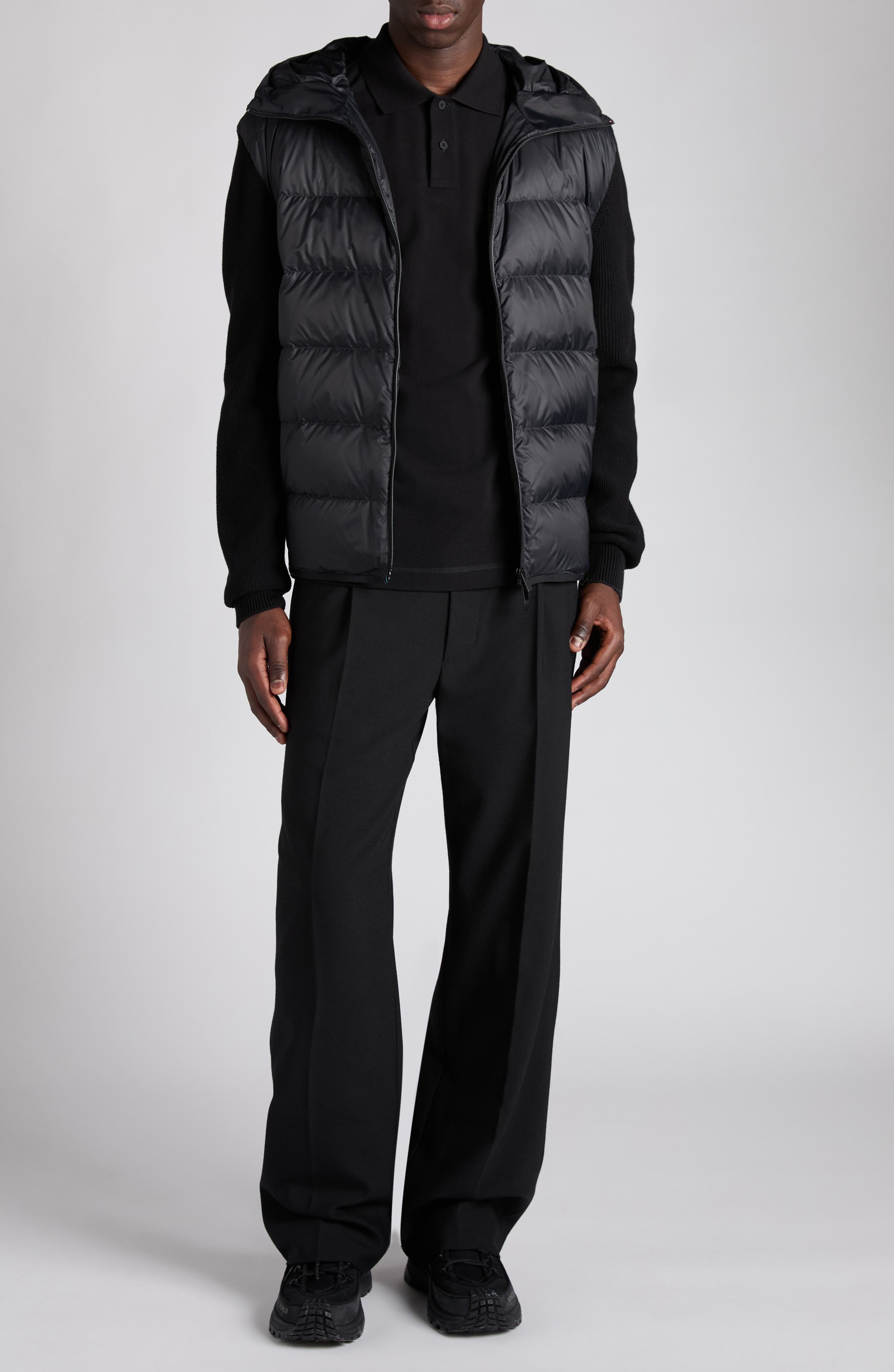 Part cardigan, part puffer, this hybrid style offers lightweight warmth with a combination of cotton knit sleeves and a down-filled nylon core and hood. Two-way front-zip closure Fixed hood Long sleeves with ribbed cuffs Partially lined, with 90% down, 10% feather fill 100% nylon with 100% cotton contrast Dry clean or hand wash, dry flat Imported Designer Clothing