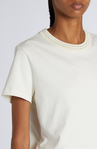 Moncler infuses a playful spirit into the classic T-shirt by crafting this all-cotton version with a distinctive chunky-knit crewneck. Crewneck Short sleeves 100% cotton Dry clean Imported Designer Clothing