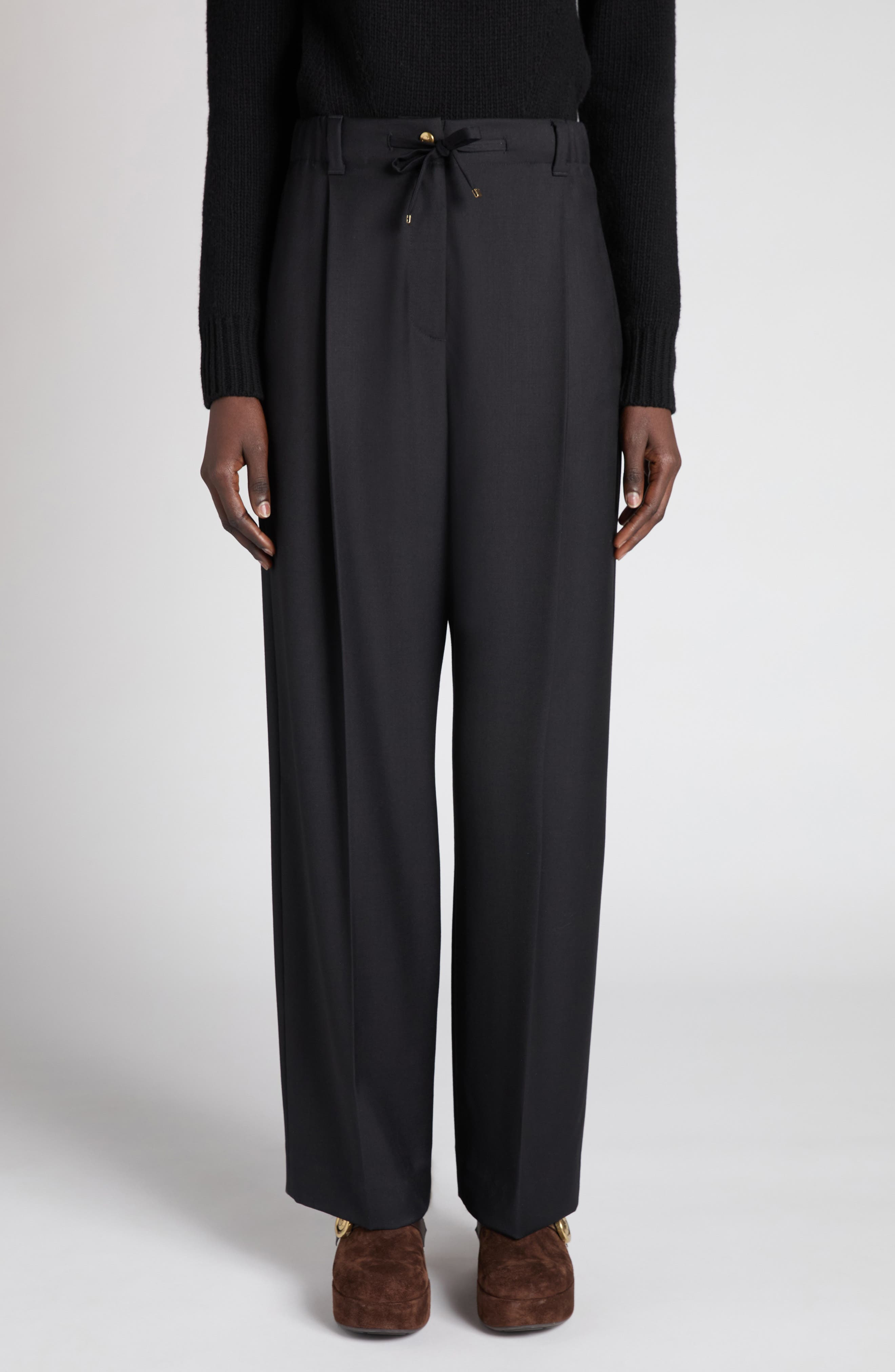 A comfortable drawstring-adjusted elastic waist and voluminous cut in a fluid, drapey wool fabric make these pants a year-round staple for a semitailored, on-trend look. Zip fly with button closure Elastic/drawstring waist Side-seam pockets; back welt pockets 100% virgin wool Dry clean Made in Romania Designer Clothing
