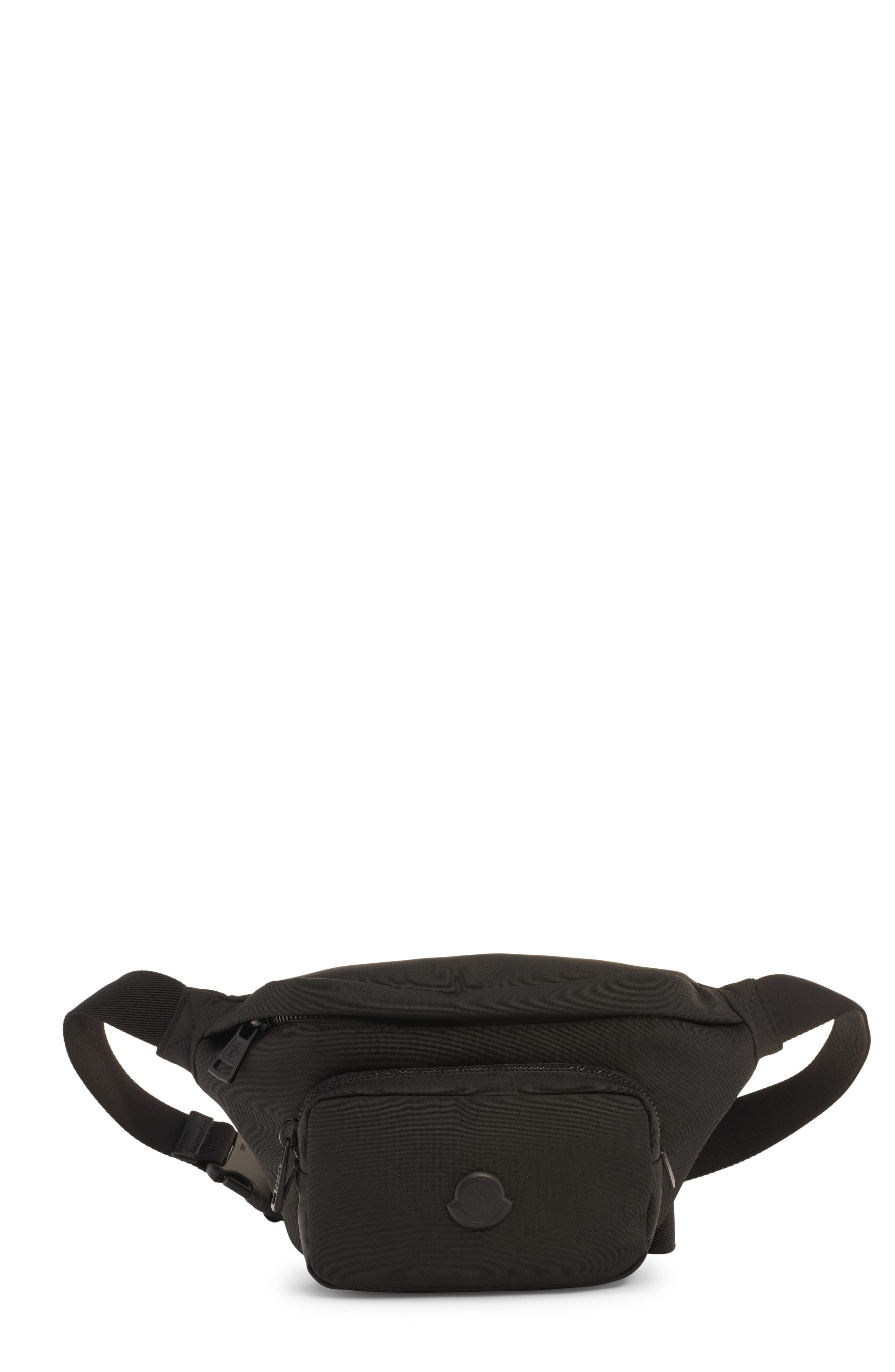 A tonal logo patch brings Moncler flair to this versatile belt bag made of water-repellent material and sized to hold the essentials for a day of running errands or travel. Top zip closure Adjustable belt/crossbody strap with squeeze buckle Exterior zip pocket Textile with leather trim Imported