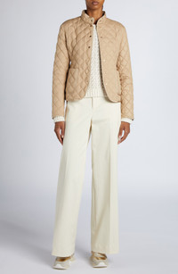 Logo-engraved snaps and tonal grosgrain trim bring refined Moncler touches to this diamond-quilted down jacket crafted in a fitted cropped silhouette. Front snap closure Stand collar Front patch pockets Lined, with 90% down, 10% feather fill (Romania) 100% polyester Dry clean Made in Romania Designer Clothing