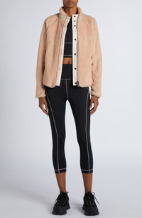 A logo patch brands this versatile jacket that reverses from plush teddy to sleek stretch fabric to double your outerwear options. Two-way front-zip closure; snap placket Stand collar Front welt pockets; front snap-welt pockets 100% polyester with 97% polyester, 3% elastane reverse Dry clean Imported Designer Clothing