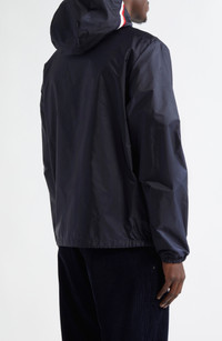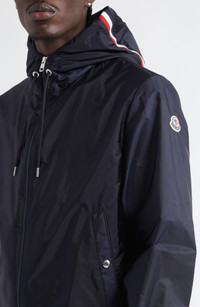 The mountaineering luxury label draws inspiration from traditional boating aesthetics with this water-repellent nylon jacket topped with a protective hood streaked with nautical stripes. 31" length (size 8) Two-way front-zip closure Drawstring hood Elastic cuffs Front snap-welt pockets Water repellent Nylon lining 100% nylon Imported Designer Clothing