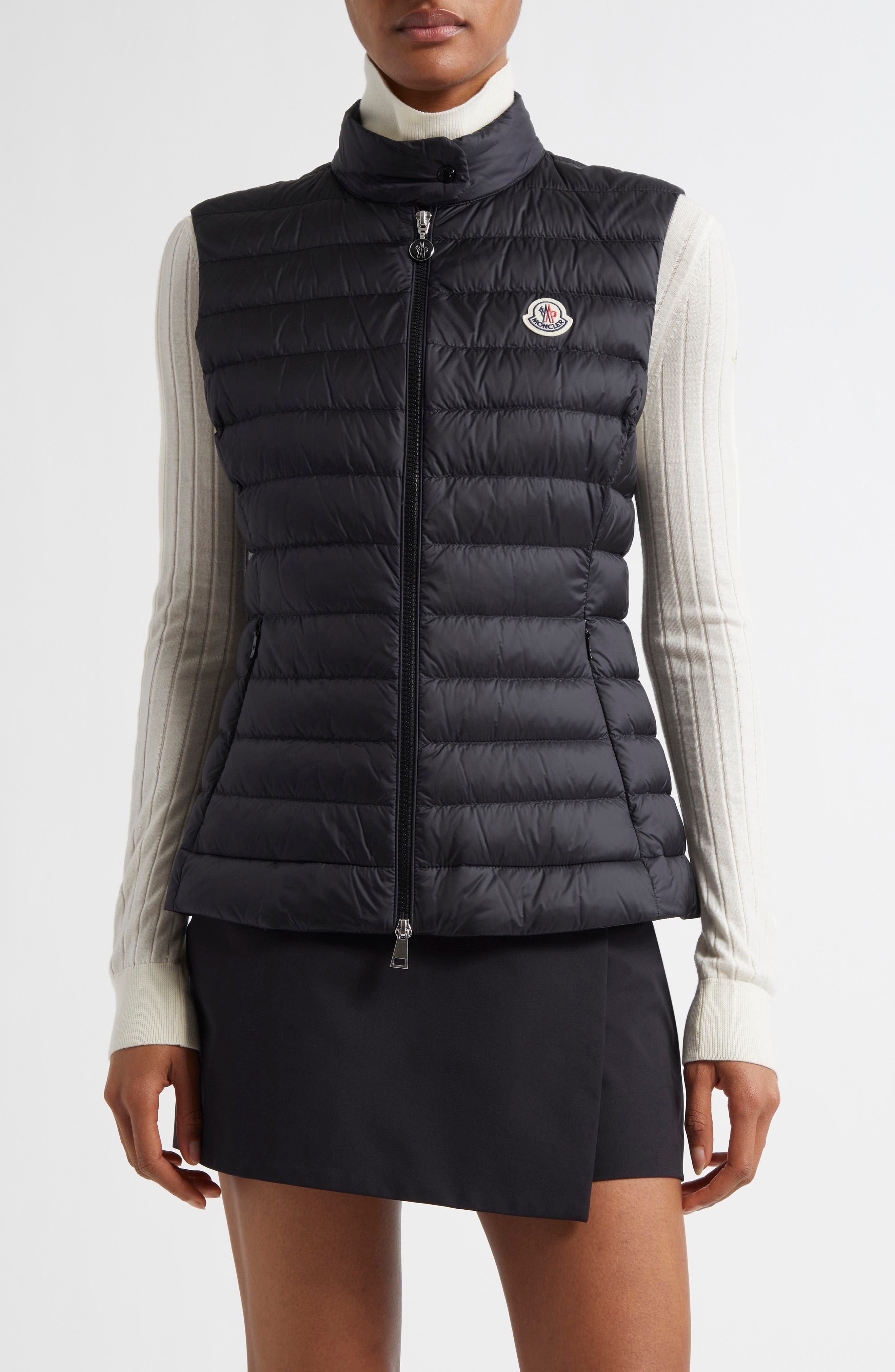 Moncler's iconic cockerel-logo patch brings in-the-know branding to this channel-quilted puffer vest that offers optimal warmth via lofty down fill. 24" length (size 2) Two-way front-zip closure Stand collar On-seam zip pockets Lined, with 90% down, 10% feather fill (Romania) 100% polyester Hand wash, dry flat Made in Romania Designer Clothing