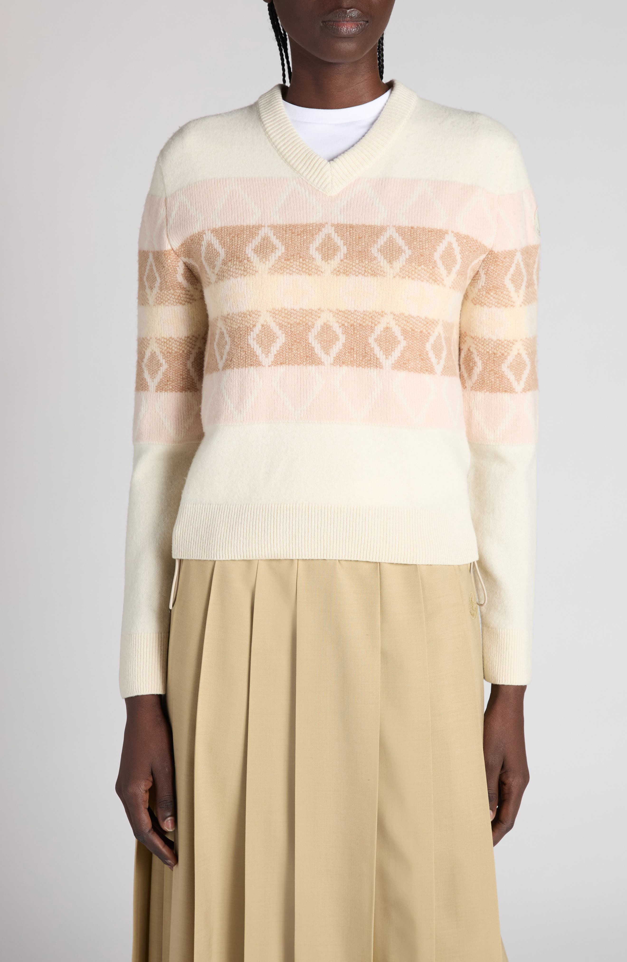 Moncler Jacquard Virgin Wool V-Neck Sweater in Silk White at Nordstrom