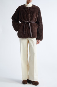 A study in textural contrasts, this down-insulated jacket offers day-to-evening versatility with its combination of plush fabrics and a sleek belt to cinch the silhouette. Hidden-snap placket Jewel neck Elastic cuffs On-seam pockets Removable belt Lined, with 90% down, 10% feather fill 100% polyester faux fur Dry clean Imported Designer Clothing