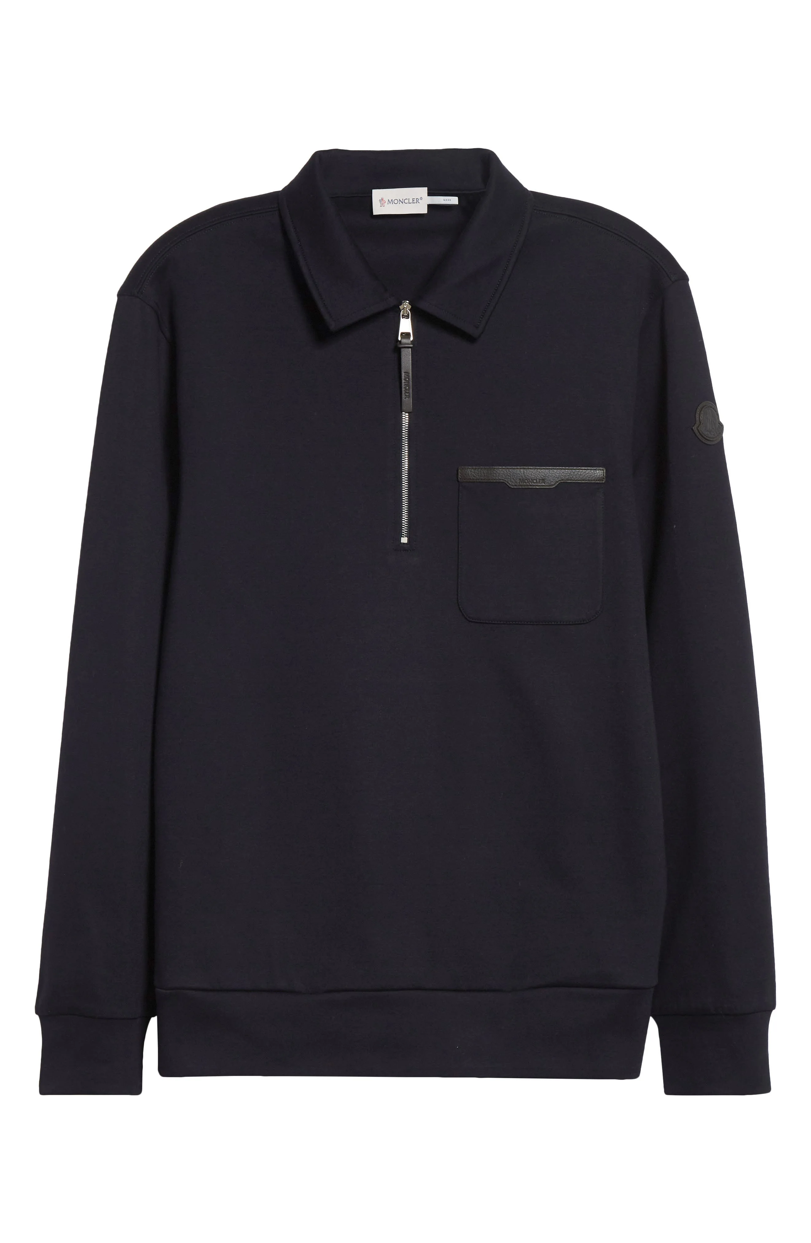 Moncler Leather Logo Cotton Blend Half Zip Pullover in Night Sky at Nordstrom
