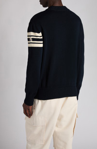 Channel classic varsity style in this cotton sweater detailed with loopy boucle logo lettering and intarsia-knit stripes. Crewneck Long sleeves 100% cotton Dry clean Imported Designer Clothing