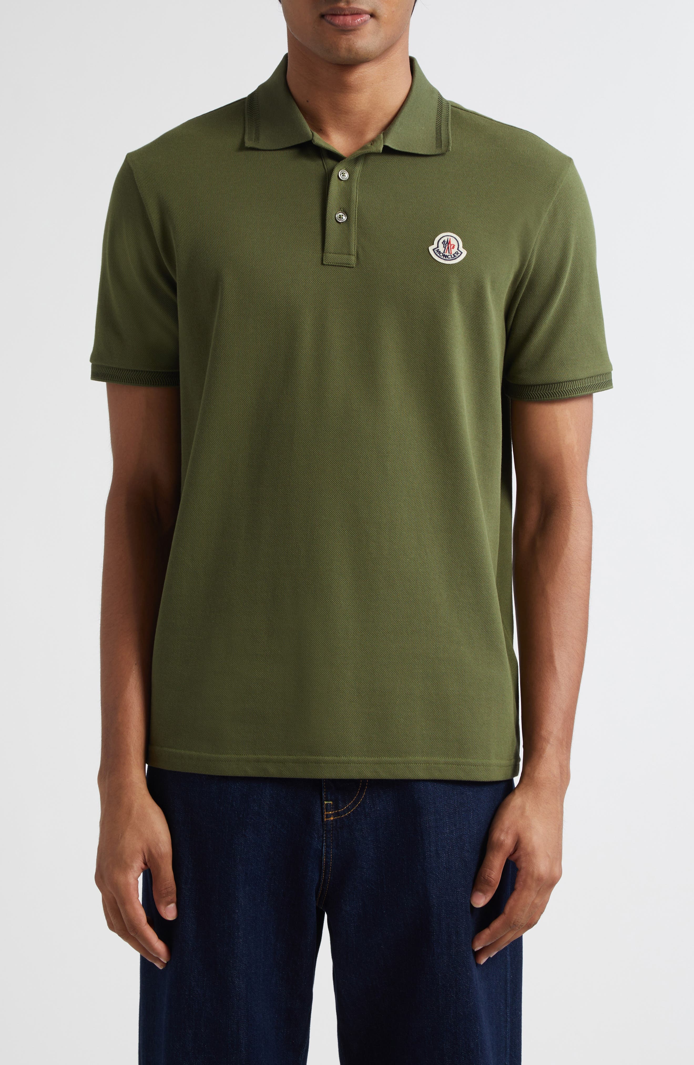Soft cotton pique offers breathable comfort in this trim polo branded with Moncler's twin-peaked cockerel patch—a nod to the brand's sporty, adventure-driven aesthetic. Button half placket Rib collar Short sleeves 100% cotton Dry clean or machine wash, dry flat Imported Designer Clothing